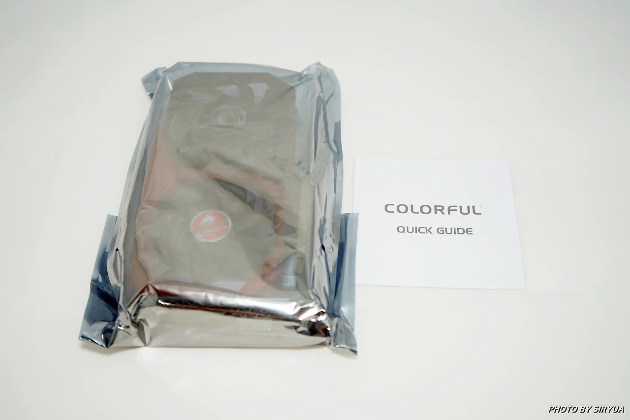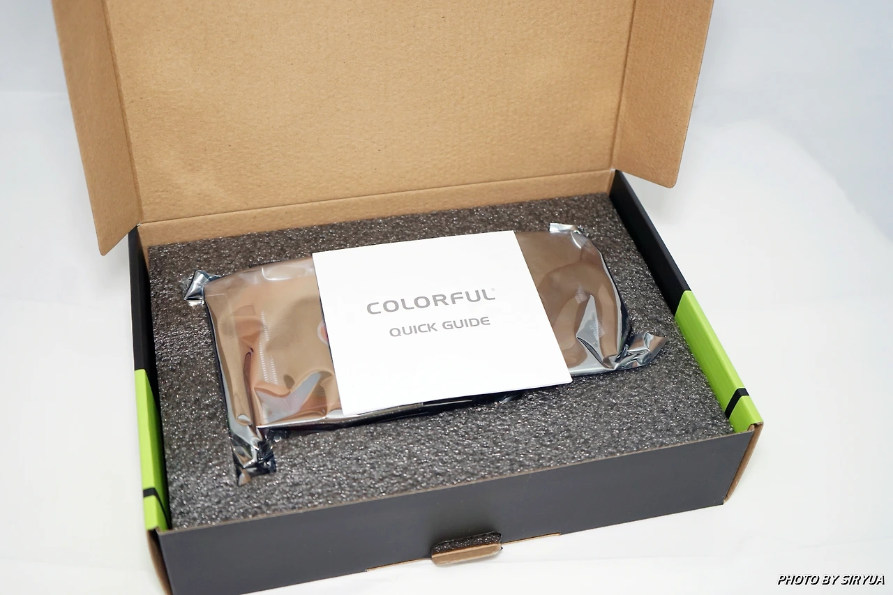 박스를 열어보면 정말 심플한 구성품을 볼 수 있습니다. 방전 비닐봉지에 포장되어 있는 컬러풀 지포스 GTX1660 SUPER 토마호크 D6 6GB 본체와 함께 퀵 가이드가 있습니다.