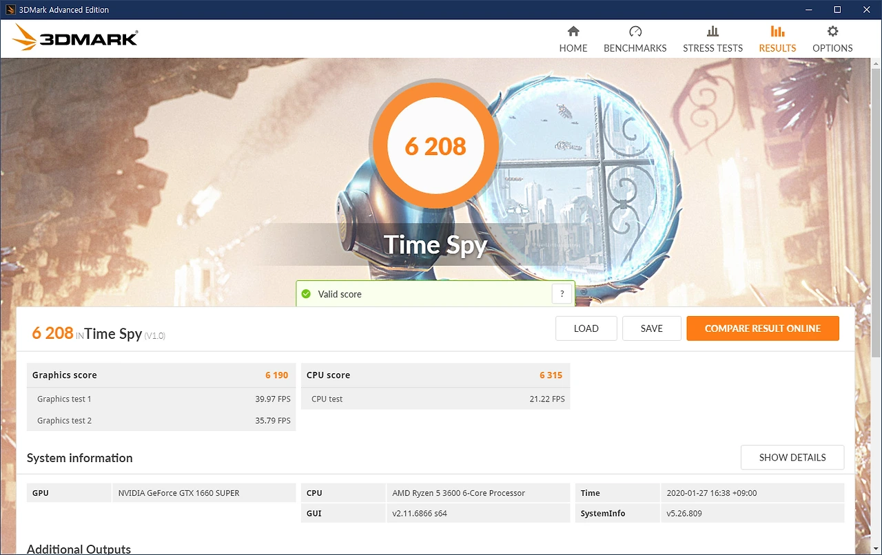 먼저, 3D Mark 측정 결과입니다. DX 11 베이스인 Fire Strike에서 15,813점으로 전 세대 상위 모델인 GTX 1070과 비교해서 다소 부족한 성능을 가지고 있습니다. 하지만 반대로 DX12 베이스인 Time Spy에서는 6,208점으로 GTX 1070보다 높은 점수를 가지고 있습니다.