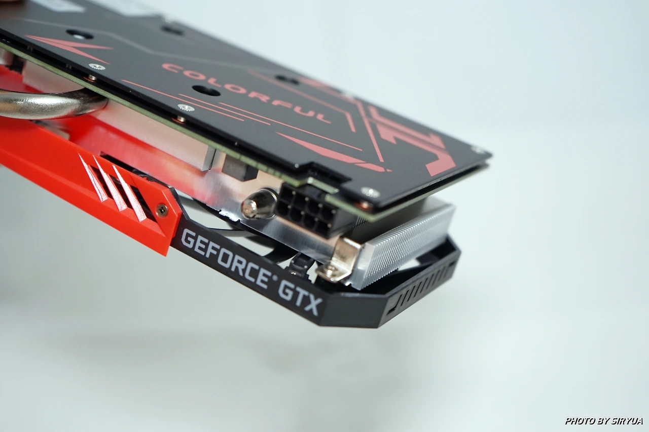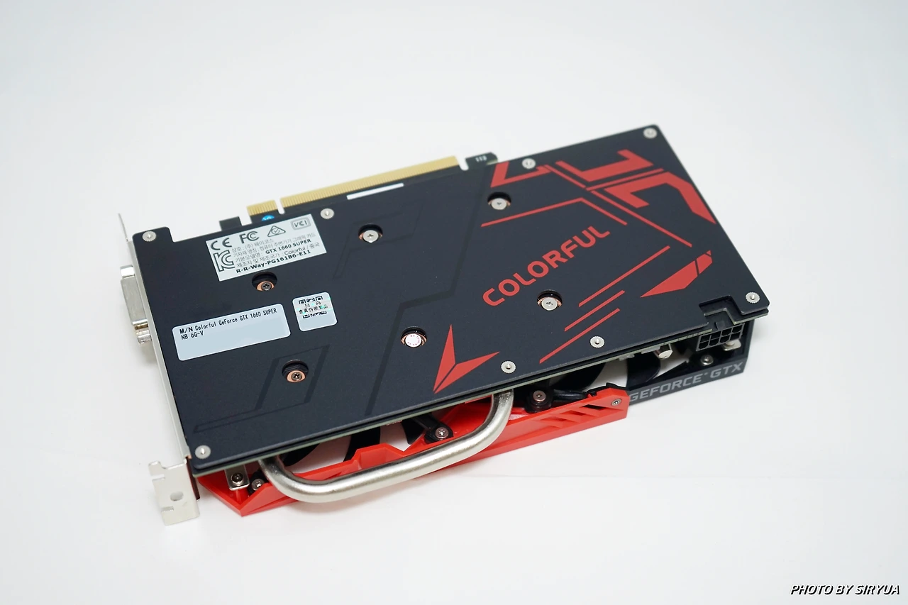 컬러풀 GTX 1660 SUPER의 전반적인 하드웨어 디자인은 검은색 바탕에 빨간색으로 포인트를 주고 있는 제품입니다. GTX 1660 SUPER 칩셋의 쿨링을 위해서 방열판과 함께 두 개의 90mm 쿨러가 있으며, 한 쪽 쿨러에는 빨간색으로 포인트를 주어서 단조로움을 탈피하고 있습니다.