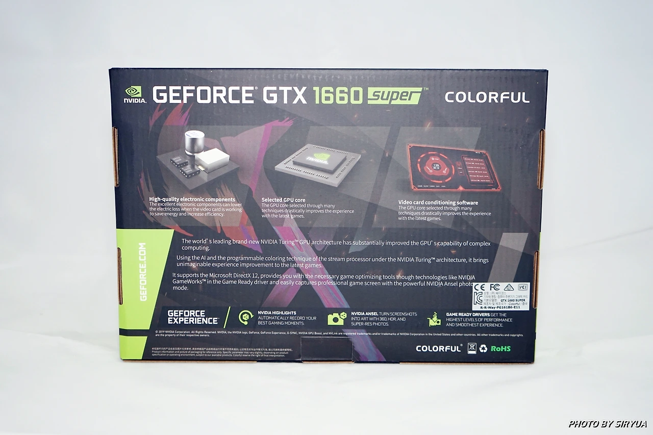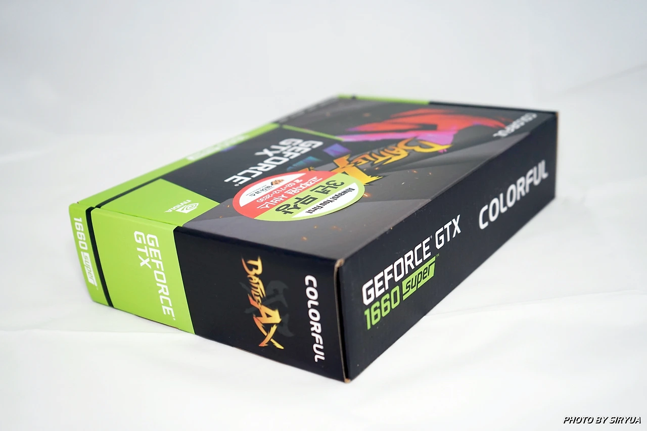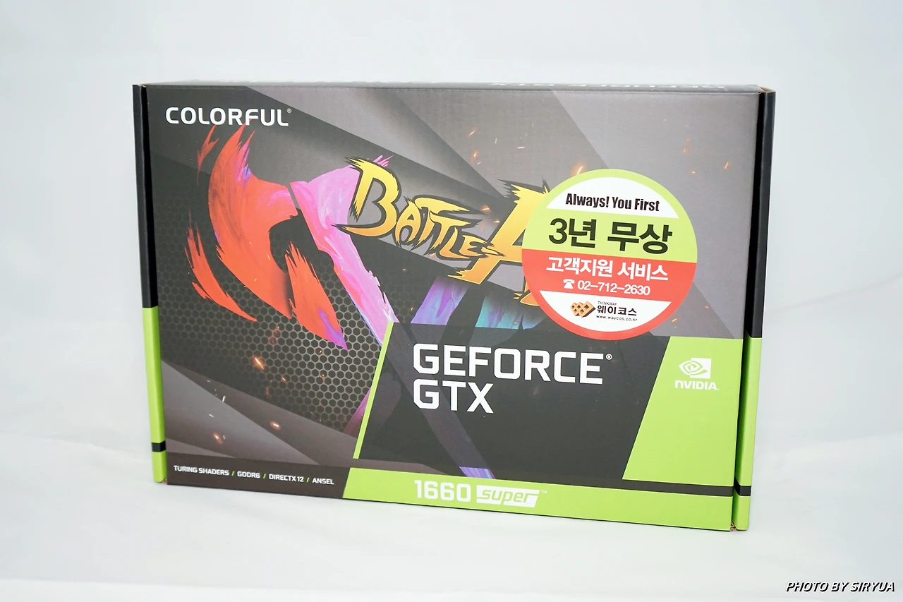 엔비디아 칩셋을 사용하고 있는 그래픽 카드의 패키지 디자인의 공통점이라면 바로 엔비디아 로고 컬러인 연녹색으로 포인트를 주고 있다는 점입니다. 컬러풀 GTX1660 SUPER 역시 연녹색으로 포인트를 주고 있으며 컬러풀사 Battle Ax 라인업의 로고로 게이밍에 특화된 제품군임을 강조해주고 있습니다. 아래쪽에는 제품 주요 강조사항인 튜링 아키텍처 적용, GDDR6 사용, DX12 및 ANSEL이 적용되어 있음을 안내합니다. 그리고 별도적으로 스티커를 통해서 3면 무상 A/S가 가능하다는 것을 추가적으로 안내해주고 있습니다.