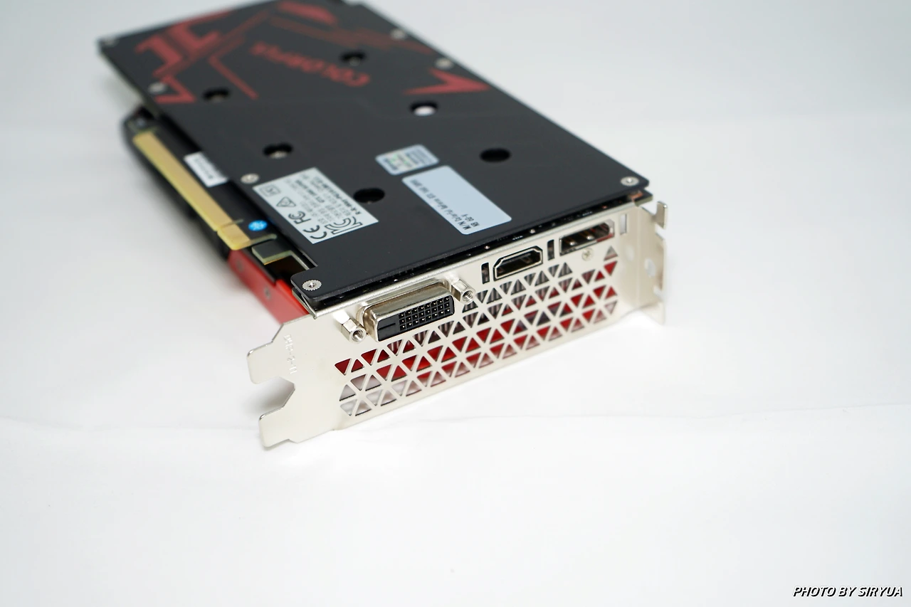 뒤로는 3개의 그래픽 인터페이스가 위치하고 있습니다. 왼쪽에서부터 DVI, HDMI2.0, DP 1.4 순으로 배치되어 있으며, 그 아래로 보다 열 순환이 잘 될 수 있도록 삼각형 모양으로 에어홀이 타공되어 있습니다.