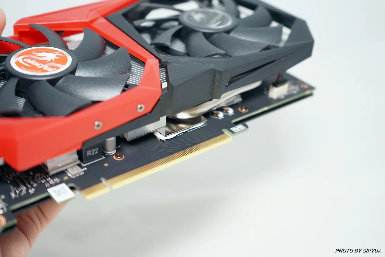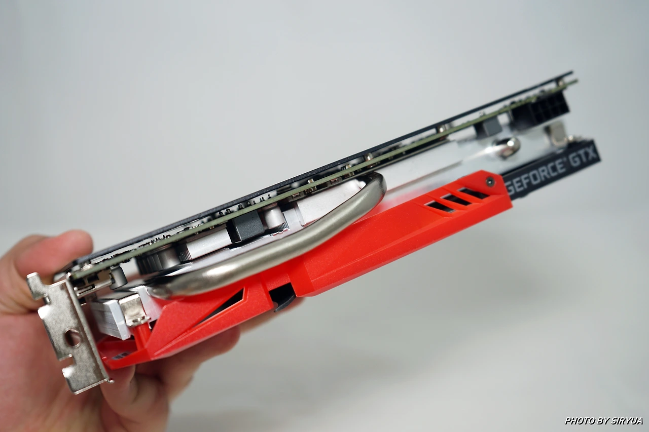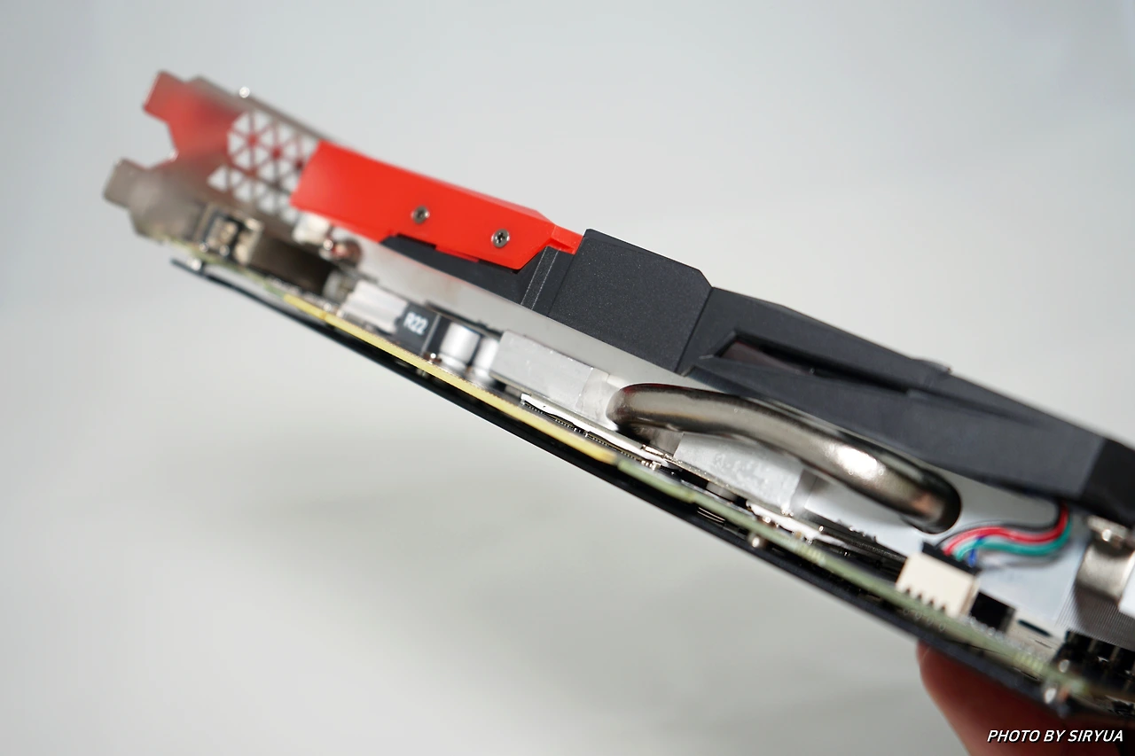 측면을 보게 되면 알루미늄 소재의 방열판이 제품의 3/4를 덮을 정도로 넓게 퍼져있는 것을 볼 수 있으며, 좌우로 8mm 파이를 가지고 있는 히트파이프가 방열판으로 열을 전달해주고 있는 것을 확인할 수 있습니다. 즉, 히트파이프를 통해서 GPU의 열이 효율적으로 방열판으로 전달되고, 방열판은 쿨링팬에 의해서 냉각이 되고 있는 구조를 가지고 있으며, 백 플레이트는 이를 보조해서 열을 분산시켜주는 형식으로 GPU가 발산하고 있는 많은 열을 냉각시켜주고 있는 구조입니다. 보급형 가성비 제품이라고 하더라도 기본적인 발열 제어에 있어서는 상당히 잘 되어있네요.