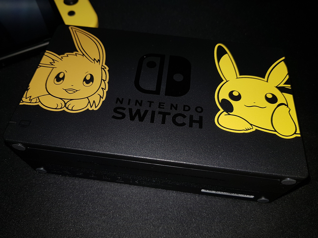 세 번째는 독입니다. 검정 바탕에 검은색으로 닌텐도 스위치 로고만 그려져 있던 일반 버전의 독과 달리, 양옆으로 이브이와 피카츄가 캐릭터 색상에 맞추어서 그려져 있습니다.