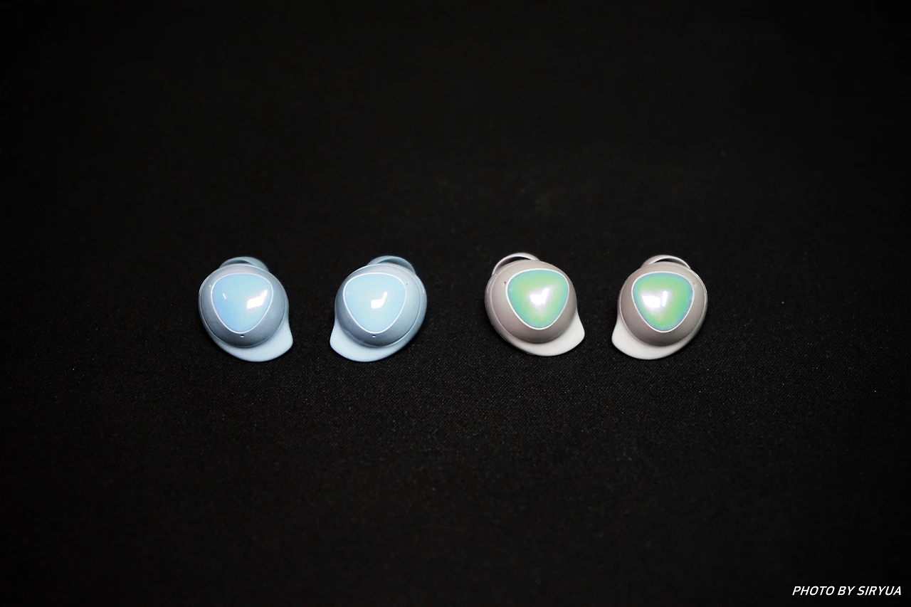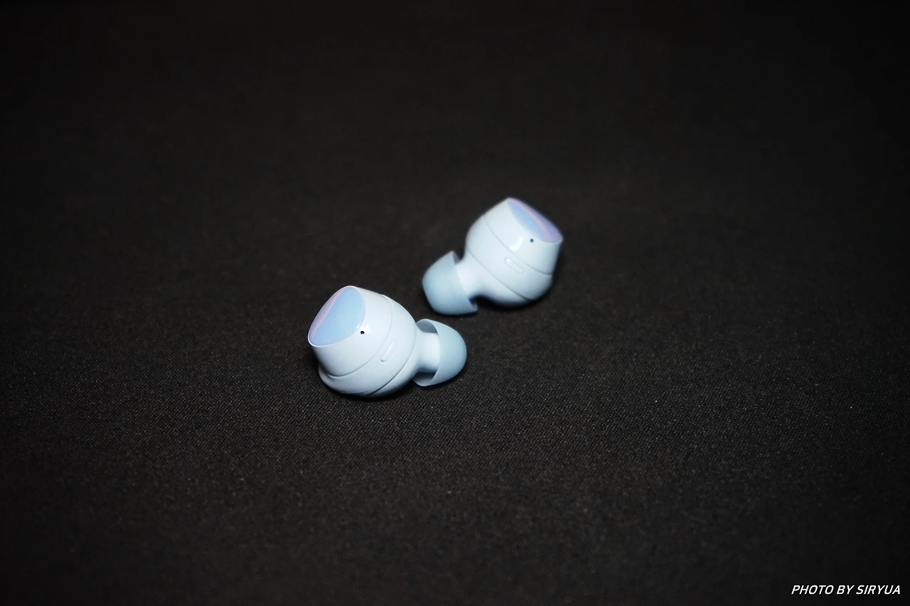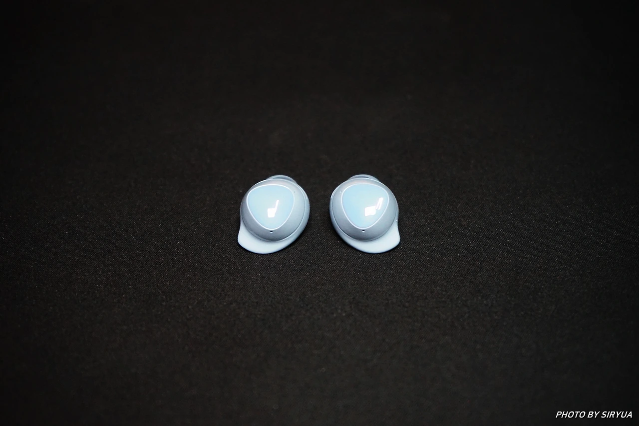 갤럭시 버즈 플러스의 이어버드 디자인은 귀에 착용하기 편하도록 곡선을 많이 써서 다듬어진 디자인입니다. 터치 인터페이스는 곡률이 많이 들어간 삼각형으로 되어있으며 주변 하우징과는 조금 다른 색감을 가지고 있습니다.