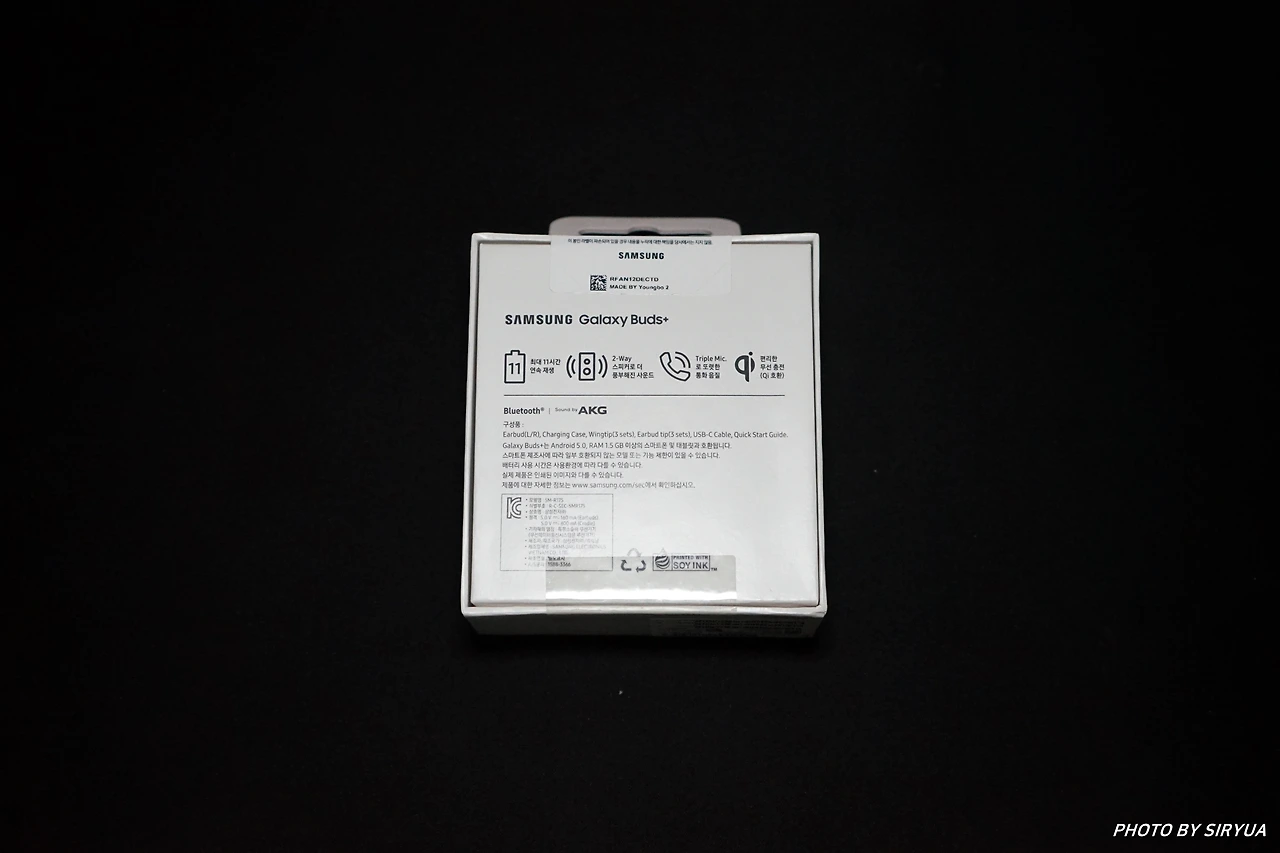 갤럭시 버즈 플러스의 박스 패키지 구성은 기존 갤럭시 버즈와 비교해서 크게 달라진 점은 없습니다. 전면에는 언제나 그렇듯 제품 이미지와 함께 버즈+ 표기가 있으며, 후면에는 주요 특징에 대해서 안내가 있습니다.