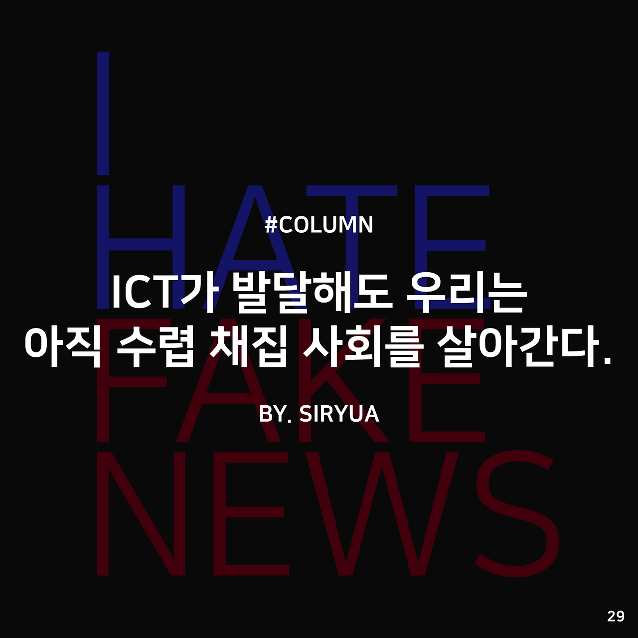 우리가 살아가고 있는 정보화 사회는 시간이 흐르면 흐를수록 점점 성숙해져 가고 있습니다. 그리고 이 과정에서 가짜 뉴스라는 성장통을 겪고 있으며, 우리는 어쩔 수 없이 정보화 사회임에도 불구하고 정보를 수렵 채집을 하고 있고요.