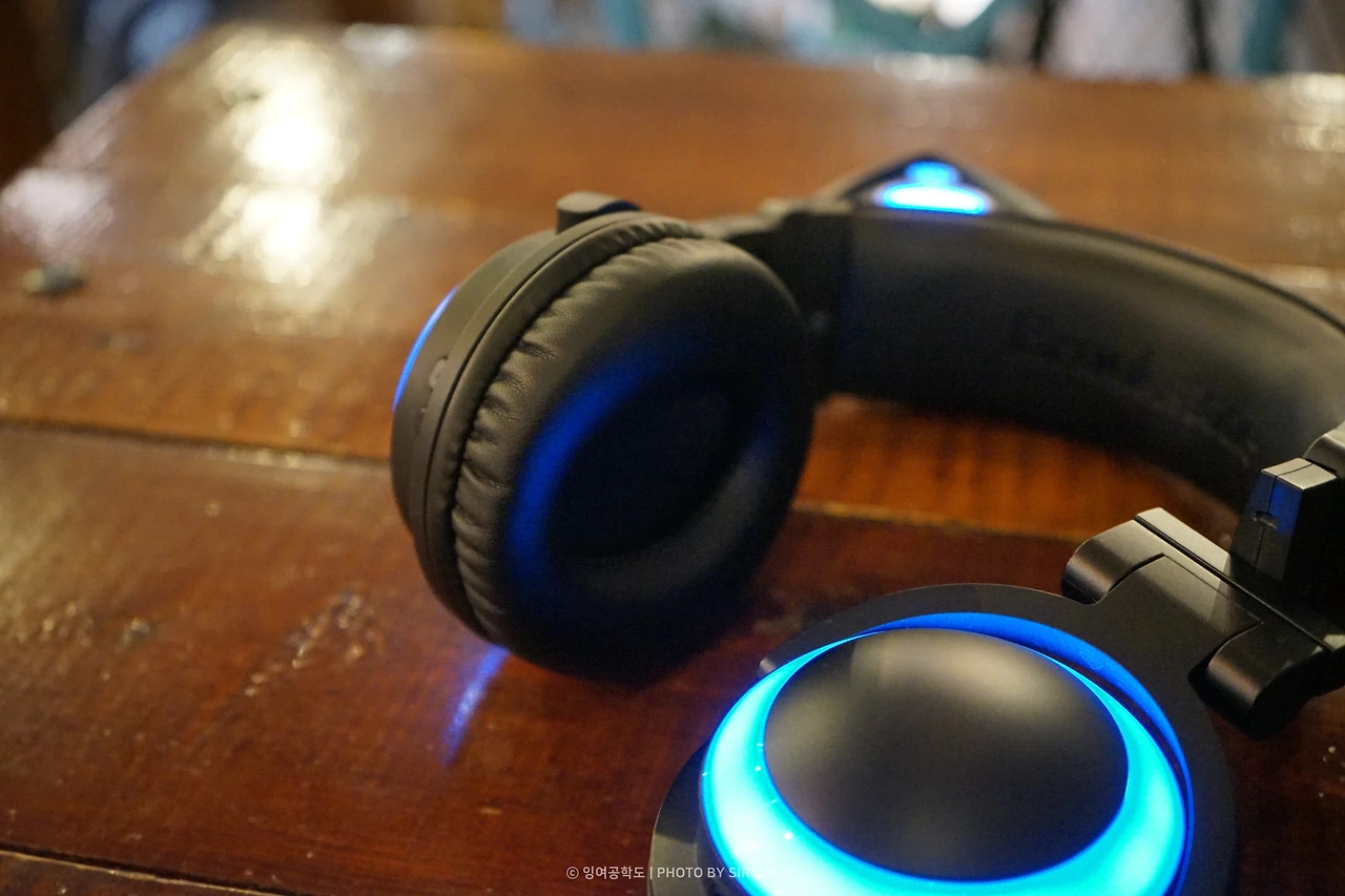 오버 이어 타입의 헤드폰으로 귀를 덮을 수 있는 이어 패드를 가지고 있으며, 일반적인 헤드폰과 비슷한 정도로 두툼함을 가지고 있습니다. 사진상에서는 잘 보이지 않지만 하우징 아래쪽에는 컨트롤 버튼과 3.5mm 입출력 단자들이 있으며, 바깥쪽에는 원형 LED 불빛이 강하게 비추어지고 있습니다.