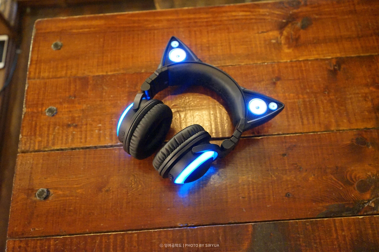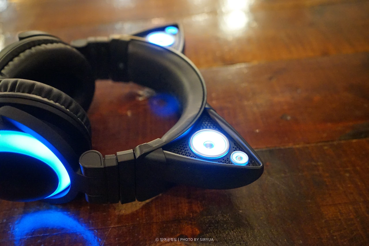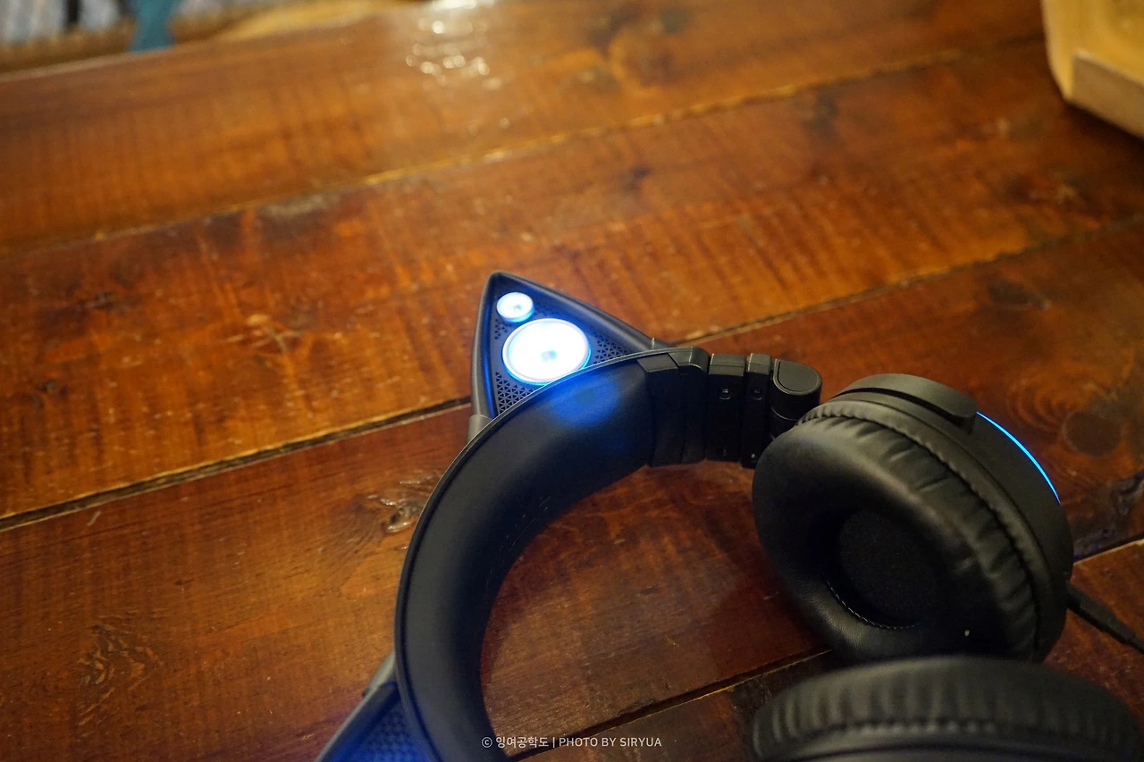 헤드폰 생김새는 일반적인 헤드폰과 동일한 구조에 고양이 귀 모양의 스피커가 추가됨으로써 상당히 독특해졌습니다. 그리고 하우징 부분과 고양이 귀 스피커에 청색 LED가 추가되어 있어 게이밍스러운 느낌을 같이 주고 있습니다.