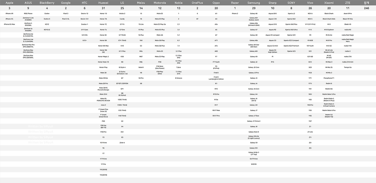 국내외 인지도가 있는 제조사 19곳에서 출시한 제품들을 인터넷 기사 및 GSMArena에 올라온 자료들을 바탕으로 한 번 정리해보았습니다. 2018년 한 해동안 약 246종 이상의 스마트폰이 출시되었으며, 빠져있는 제조사까지 포함할 경우 이보다 훨씬 더 많은 제품이 우리 곁으로 다가온 것을 알 수 있습니다.