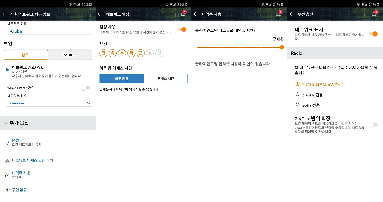 직원(일반 사용자) Wi Fi, 게스트 Wi Fi 등 각 네트워크 추가 및 제어, 설정을 진행하는 페이지입니다. 클라이언트 별 IP 할당 범위(DHCP 범위), 네트워크 접근 가능 일정 설정, 대역폭 제한, 2.4Ghz와 5Ghz 대역 사용 유무 등 Wi Fi 구성에 대해서 조절이 가능합니다.
