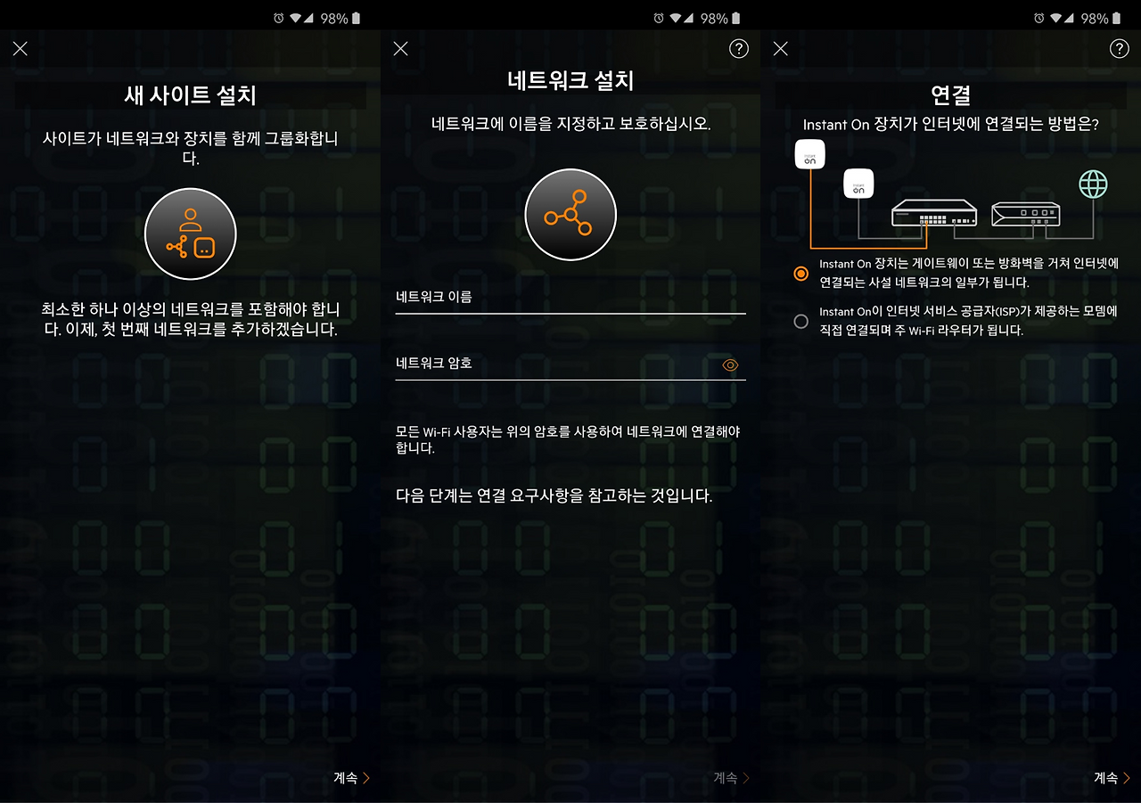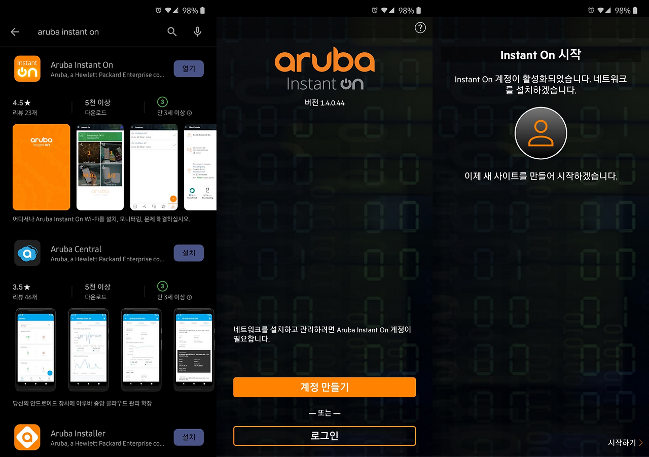 아루바 인스턴트 온 관리 앱은 구글 플레이 스토어나 애플 앱 스토어에서 Aruba 또는 Instant On을 검색하면 최상위에 배치되어 있습니다. 설치 후 첫 실행을 진행하면 계정 만들기 또는 로그인 항목이 나오는데, 계정이 없다면 계정을 생성하고, 있다면 로그인을 하는 것으로 새 사이트 만들기 시작하면서 기본 설정이 시작됩니다.