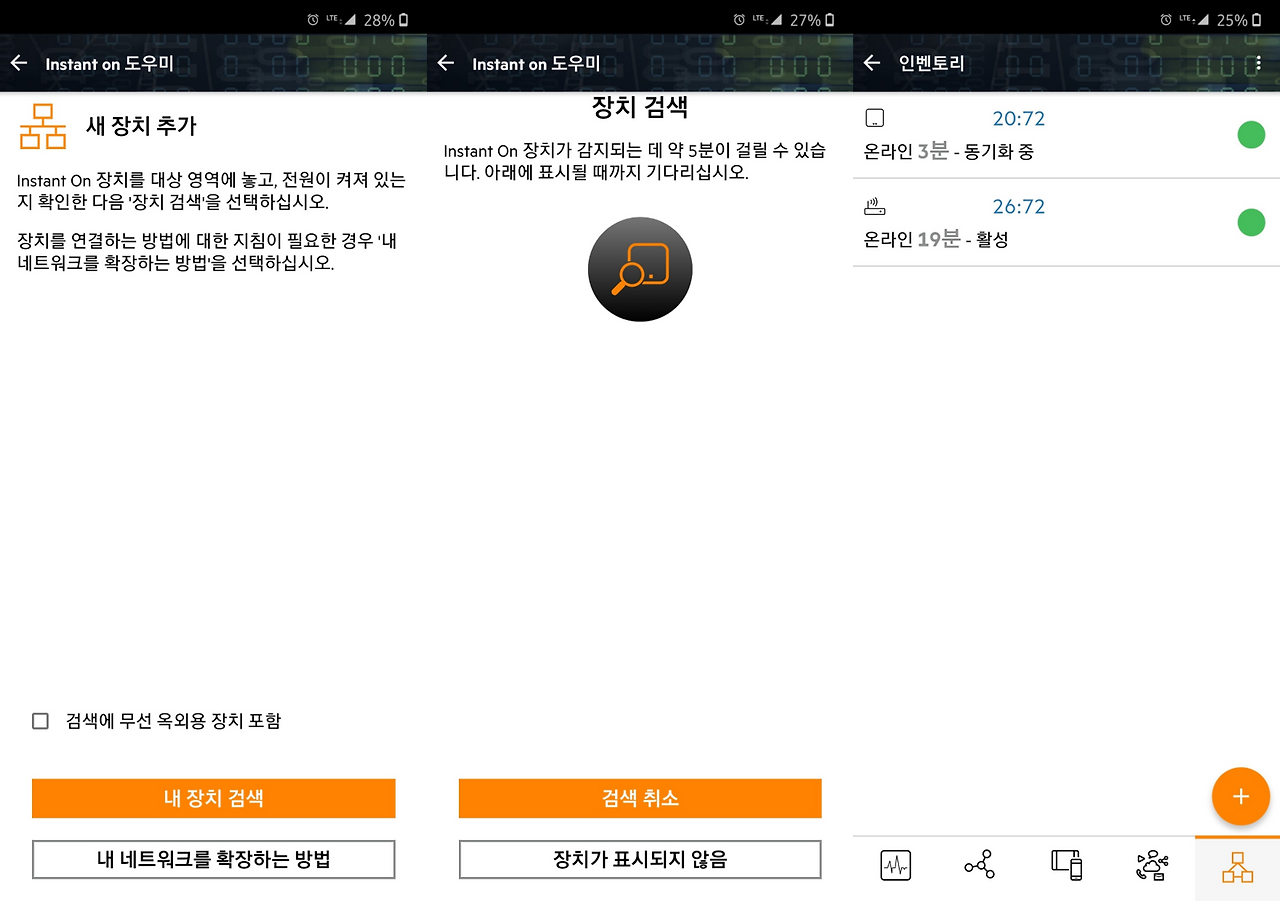 아루바 인스턴트 온의 Smart Mesh 세팅은 굳이 설명을 할 필요성이 전혀 없습니다. 너무 간편하게 됩니다. 그저 앱 인벤토리 메뉴에서 플로팅 되어있는 + 버튼을 누르고 내 장치 검색을 통해서 앞서 전원을 연결해둔 AP를 찾는 것으로 끝납니다. 정말 누구나 손쉽게 AP를 추가, 메시 와이파이를 구성해서 사용할 수 있도록 되어있습니다.