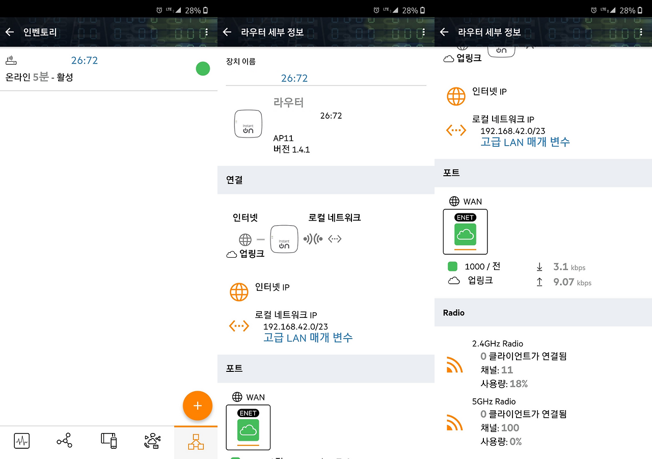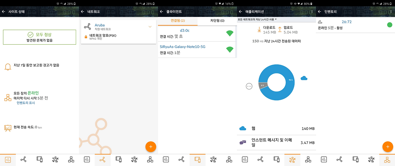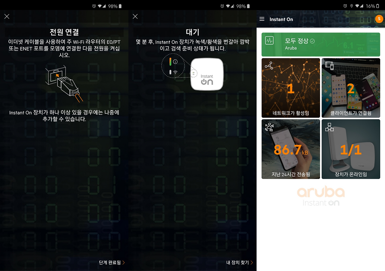 아루바 인스턴트 온의 초기 세팅은 계정 생성만 되어있다면 약 1~2분 내외(위의 영상 기준 42초), 계정을 생성하고 설정을 진행한다고 하더라도 5분 내외로 기본적인 설정을 마무리하고 사용할 수 있을 정도로 정말 간단하게 설정이 가능합니다. 그만큼 관리 앱 구성이 심플하게 잘 되어있는데 차근차근 한 번 보겠습니다.
