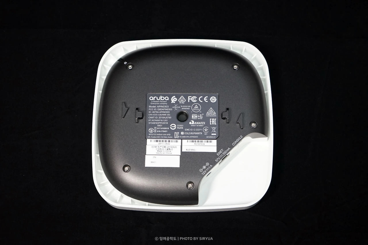 아루바 인스턴트 온 AP11의 본체는 흰색에 우리가 스마트폰 아이콘으로 많이 보는 스퀘어클(Squircle) 형태로 어디든 깔끔하게 설치할 수 있도록 작고 심플하게 되어있습니다. 커버 자체는 플라스틱 소재로 되어있으며, 상단의 시리얼 라벨을 제외하면 음각으로 표기되어 있는 aruba 로고와 회색으로 프린트된 Instant On 로고 이외의 디자인적 포인트는 일절 없습니다.