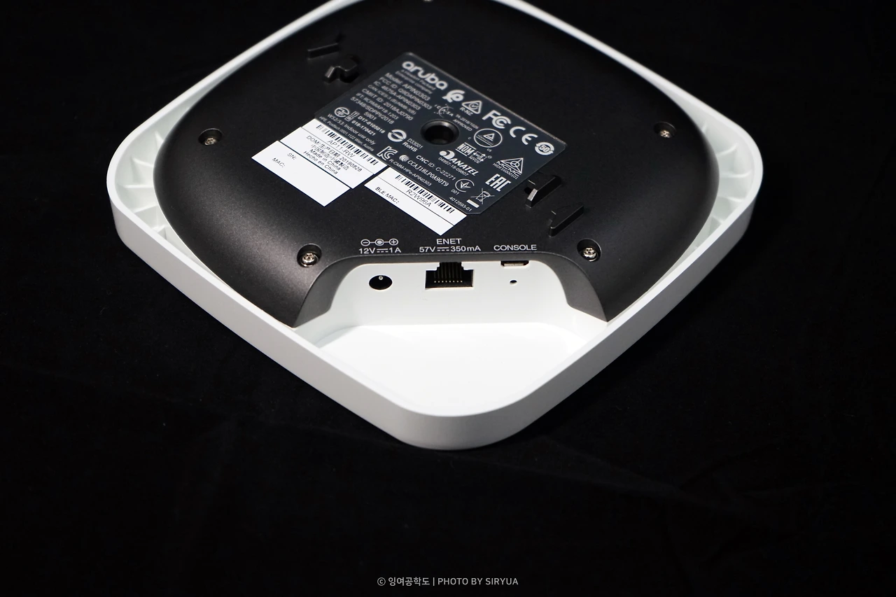 우측 하단 모서리에는 4개의 인터페이스가 위치하고 있는데, 사진 기준 왼쪽에서부터 12V DC 전원 포트, 이더넷 포트, 콘솔 포트, 리셋 버튼이 위치하고 있습니다. 엔터프라이즈 환경에서 무선 사용에 특화되어있는 제품이다 보니, 우리가 가정에서 많이 사용하고 있는 일반적인 무선 AP들과 달리 별도의 유선 허브 기능은 제공하지 않습니다.