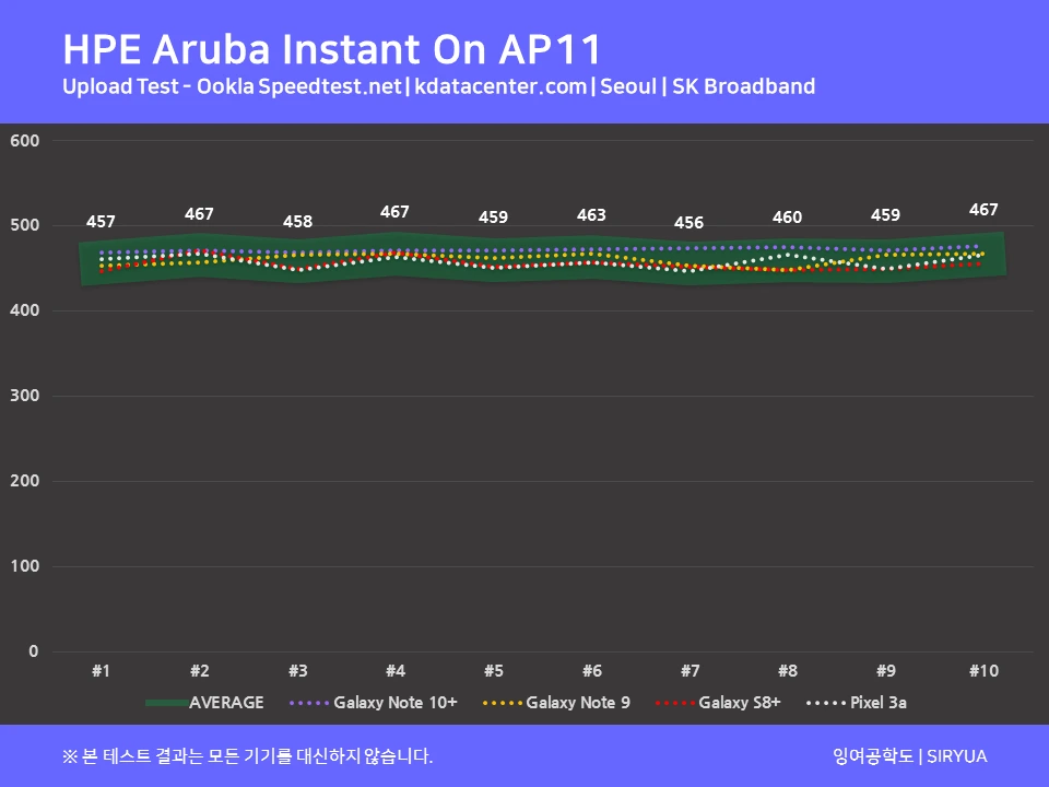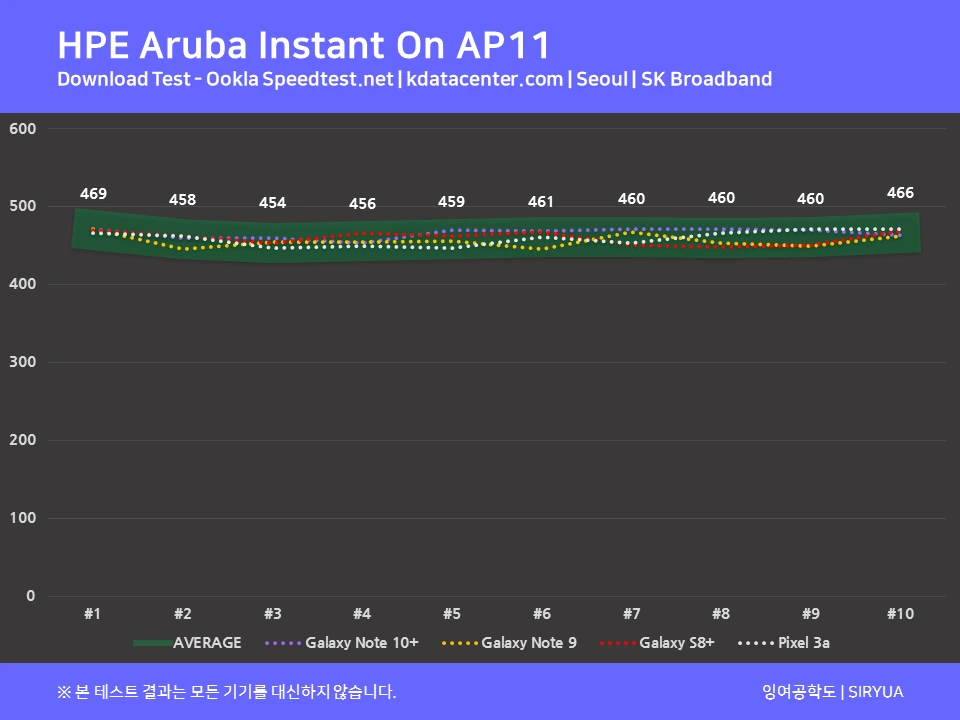 갤럭시 노트 10+ / 갤럭시 노트 9 / 갤럭시 S8+ / 픽셀 3a를 통해서 아루바 인스턴트 온 AP11의 네트워크 성능 측정 결과, 전체 단말기 평균 업로드 약 461Mbps, 다운로드 약 460Mbps로 큰 성능 저하 없이 상당히 안정적인 네트워크 성능을 보여주고 있습니다.
