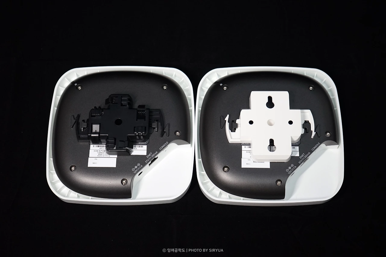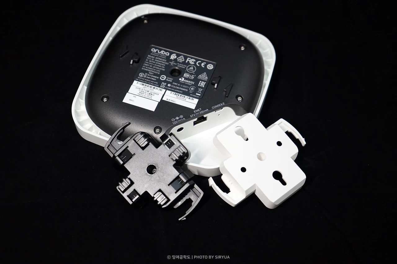 아루바 인스턴트 온 같은 경우 벽면 거치를 중점으로 설계된 제품이다 보니까, 일반적으로 바닥에 눕혀서 사용할 수 있는 무선 AP들과 달리 마운트 키트 고정 부분이 튀어나와있습니다.