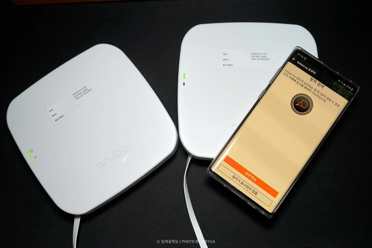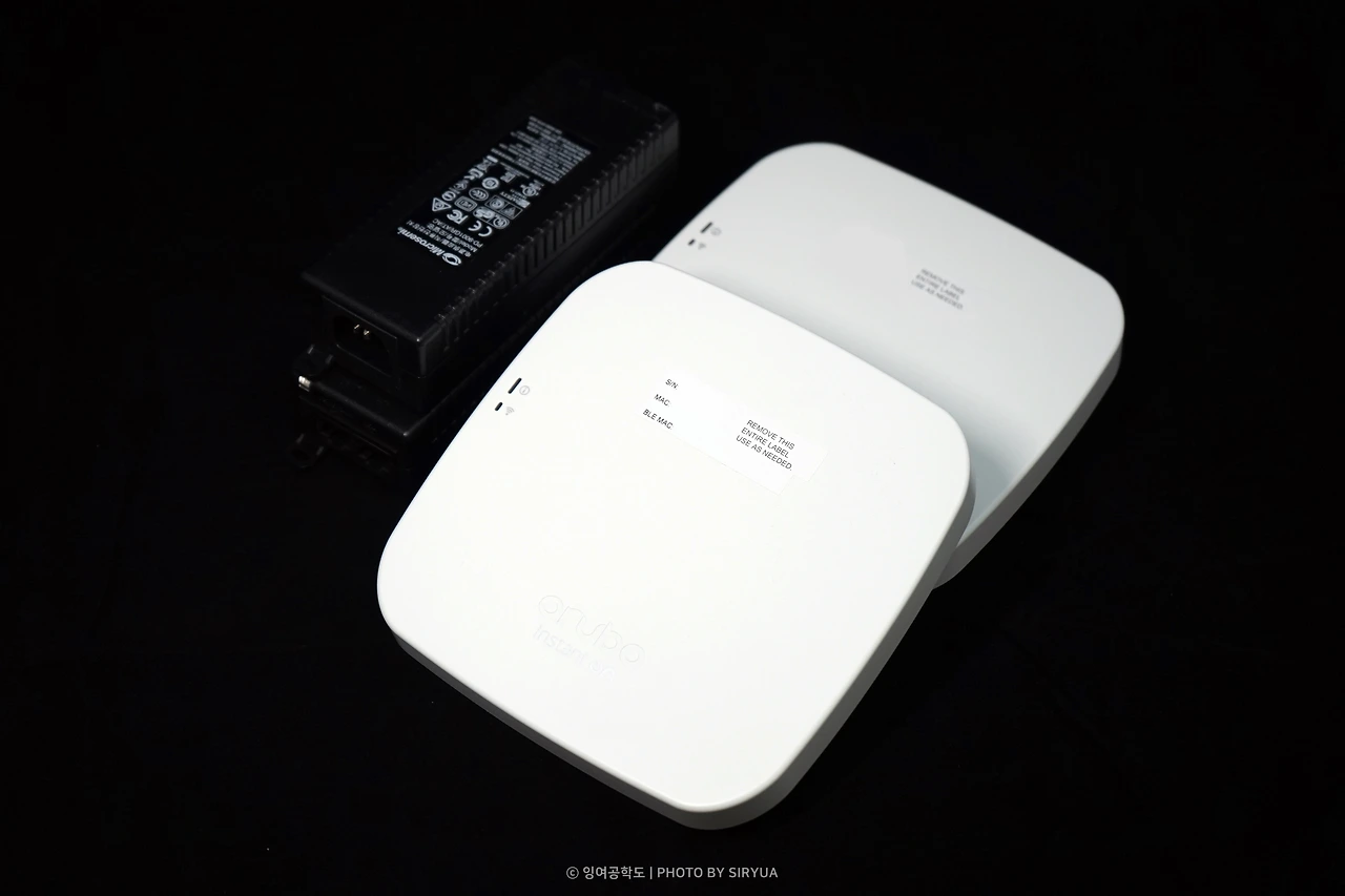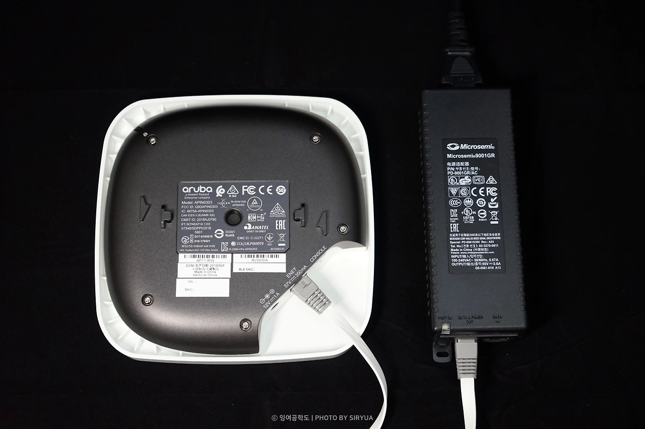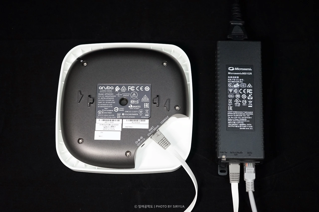 바로 위의 사진처럼 말이지요. PoE 인젝터에 AC 220V 전원과 메인에서 오는 랜선을 IN 포트에 꼽고, OUT 포트에 랜선을 꼽아서 아루바 인스턴트 온 본체의 이더넷 포트에 연결하는 것으로 정말 심플하게 배선 작업이 끝납니다.