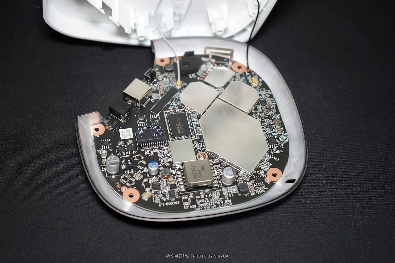 회로 디자인이 상당히 깔끔하게 잘 되어있으며, 발열 및 간섭 대응에 있어서도 잘 되어있습니다. 특히, 상품 판매 페이지 설명에도 강조하고 있는 요소 중 하나인데, 아루바 인스턴트 온이 제공해 주고 있는 각종 네트워크 통신에 사용되는 여러 RF 모듈들이 쉴드용 차폐막으로 개별적으로 나뉘어있습니다. 이에 따라 노이즈로 인해 모듈 간 간섭이 발생하는 경우에 대해서 억제할 수 있도록 설계가 잘 되어있습니다.