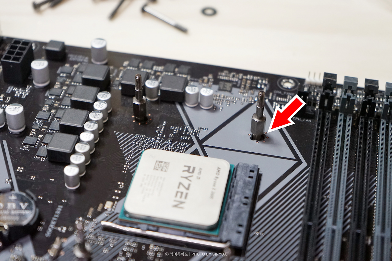 이후 메인보드 뒤에 구멍 맞추어 놔두고, 워터 블록을 고정시킬 서포트를 결합시켰습니다. 결합 이후 보니까 꽤나 아쉬운 부분을 하나 발견했는데.. 바로 메인보드의 구멍이 서포트보다 크다 보니까 은근히 크게 흔들림이 있었습니다.