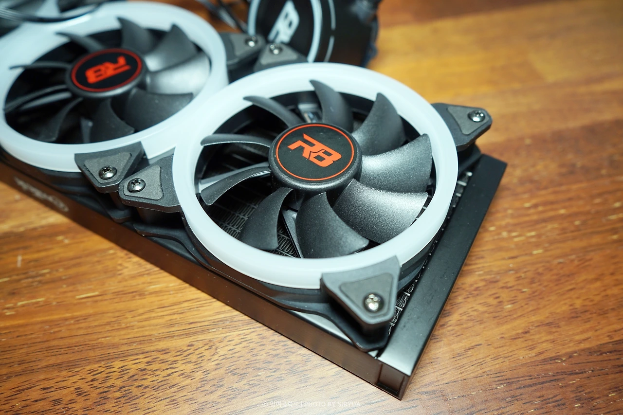 라디에이터 위에 부착되는 3개의 120 mm 쿨링팬은 Hydaulic 베어링을 사용하고 있으며, 9장의 블레이드(날개)는 일반적인 팬과 마찬가지로 평범하게 생겼습니다. 저 RPM에서는 소음이 거의 들리지 않으며, 고 RPM에 있어서도 게임 플레이에 방해가 되지 않을 정도로 어느 정도 준수한 소음을 보여주고 있으며, 무난한 수준의 효율을 보여줍니다. (아래 후술할 성능 관련 참고) LED는 팬 주변으로 둘러진 흰색 테두리에서 무지개 모양으로 비추어지는데, 다른 효과 없이 단순하게 비추어지는 점이 조금 아쉽게 다가오기도 합니다.