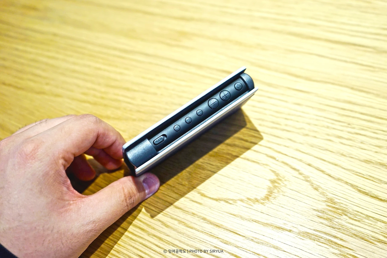 우측면은 여타 다른 워크맨 제품들과 마찬가지로 터치 인터페이스를 활용하지 않더라도 컨트롤할 수 있는 스위치와 버튼이 사진 기준 왼쪽에서부터 홀드, 재생 제어, 볼륨 제어, 전원 버튼 순서대로 위치하고 있습니다.