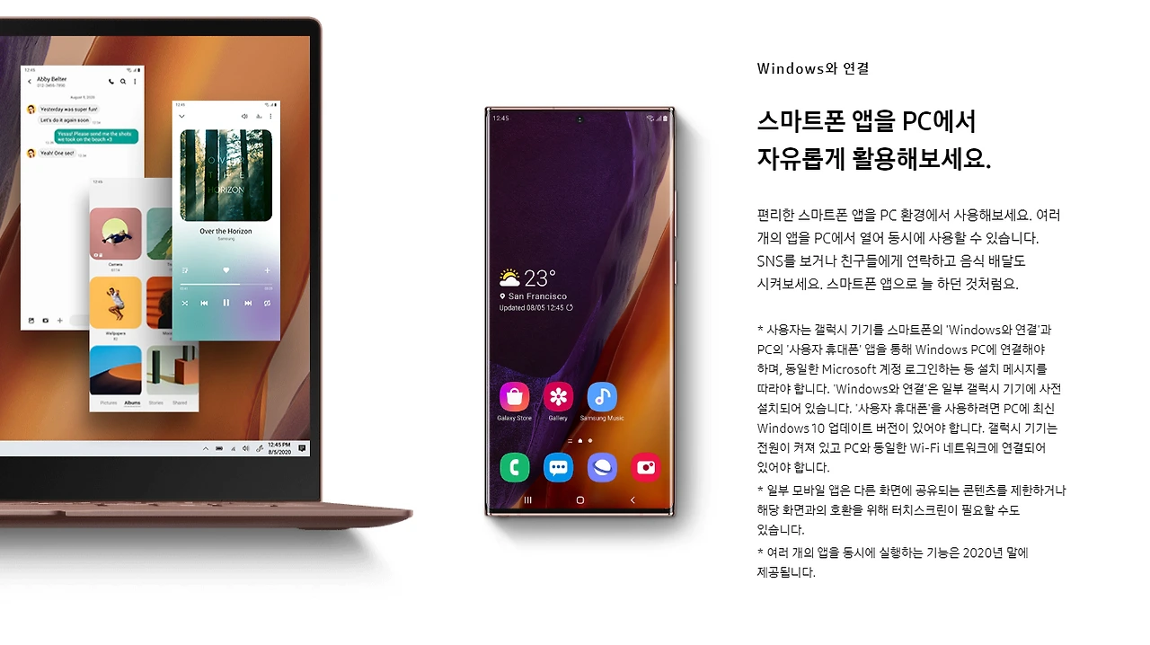 이번 언팩 행사를 전체적으로 정리해보았을 때, 갤럭시 Z 폴드 2를 제외하고 모든 단말기의 주 포커스는 다른 것보다 연동성에 맞추고 있다고 생각됩니다. 마이크로소프트와의 협업을 통해서 삼성 단말기와 Windows PC와의 연동성이 매우 강화되었고, 그 결과 삼성 노트와 원 노트의 동기화부터 시작해서 Windows PC에서 폰에 설치되어 있는 앱을 바로 실행해서 미러링 하는 것까지 이루어졌습니다. 11월 즈음 업데이트를 통해서 본격적으로 지원이 될 예정이라고 하는데 여러모로 어서 빨리 사용할 수 있는 시점이 왔으면 합니다 ㅎㅎ