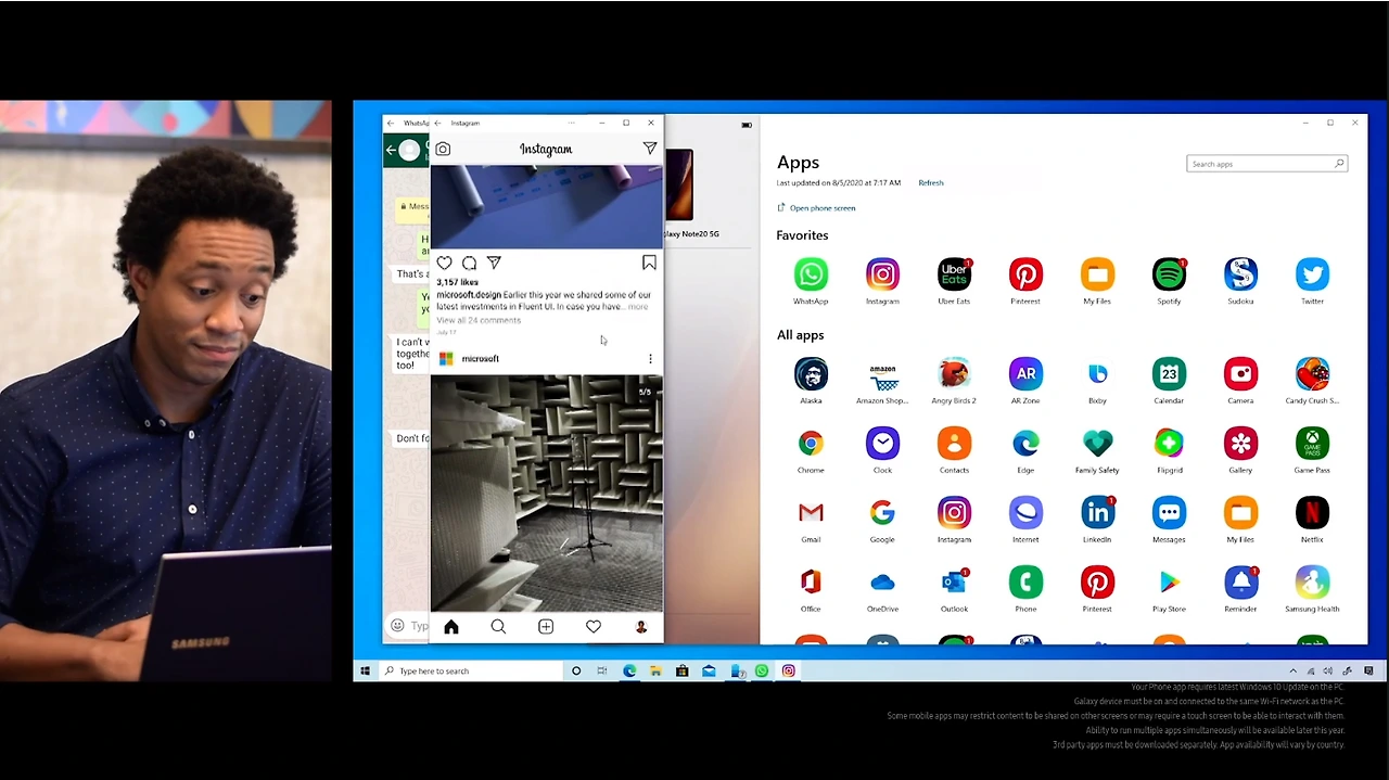 세 번째, 스마트폰 앱을 Windows PC에서 자유롭게 사용할 수 있습니다. 기존 사용자 휴대폰 앱을 통해서 제공해 주고 있던 화면 미러링 기능이 더욱더 강화되어 PC에서 앱을 실행하는 것처럼 사용할 수 있게 된 셈인데.. 여러모로 PC버전 DeX보다 더 효율성이 높다고 생각됩니다.