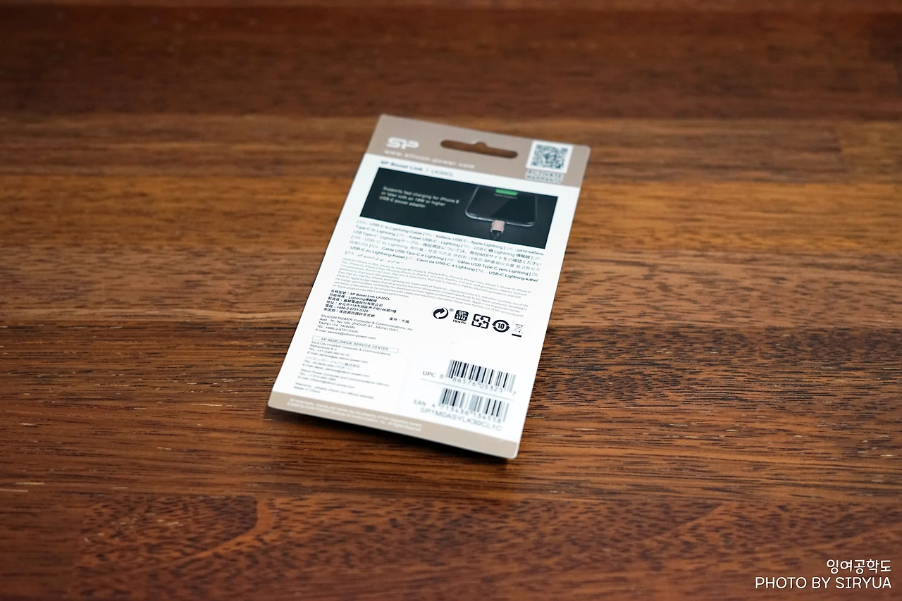 실리콘 파워 라이트닝 타입 씨 케이블의 패키지는 종이에 플라스틱을 접착하여 만드는 전형적인 일회성 포장을 사용하고 있습니다. 전면에는 제품 장점인 내구성과 MFi 인증에 대해서 안내해주고 있으며, 뒷면에는 각종 인증사항에 대해서 안내해주고 있습니다. 종이 재질인 뒷면을 찢어서 제품을 꺼내 살펴보지요.