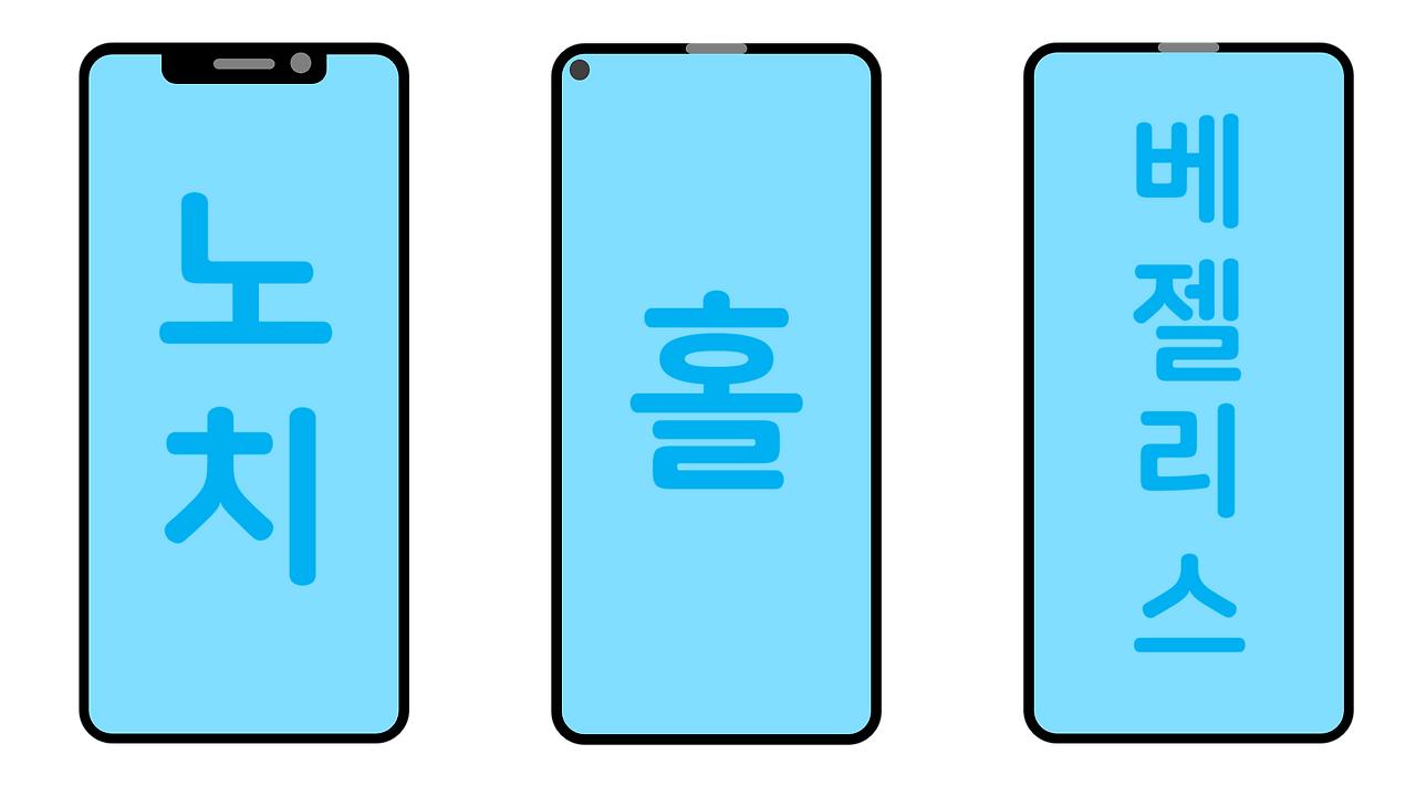 지금까지 나온 디스플레이의 변화를 동일한 크기에 놓고 보았을 때, 노치[4]와 홀[5] 디스플레이는 이전까지 사용했었던 디스플레이와 달리 카메라와 센서 위치를 최대한 줄이고 베젤을 최소화시켜서 공간의 활용성을 확보했다는 장점과 함께 디스플레이 면적이 상대적으로 넓기 때문에 더 큰 디스플레이로 느껴지면서 더 많은 정보를 볼 수 있을 것이라 생각합니다.