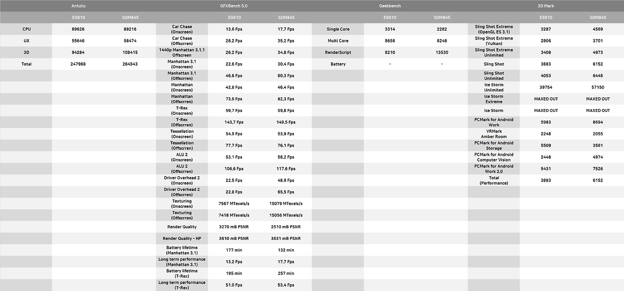 이전 작인 엑시노스 8895와 스냅드래곤 835를 비교하게 되면 벤치마크 프로그램마다 결과가 상당히 다른 것을 볼 수 있습니다. Geekbench와 GFXBench에서는 엑시노스 모델이 우위에 있었으며, 반대로 Antutu나 3D Mark 같은 경우 스냅드래곤 모델이 우위에 있는 상황입니다.
