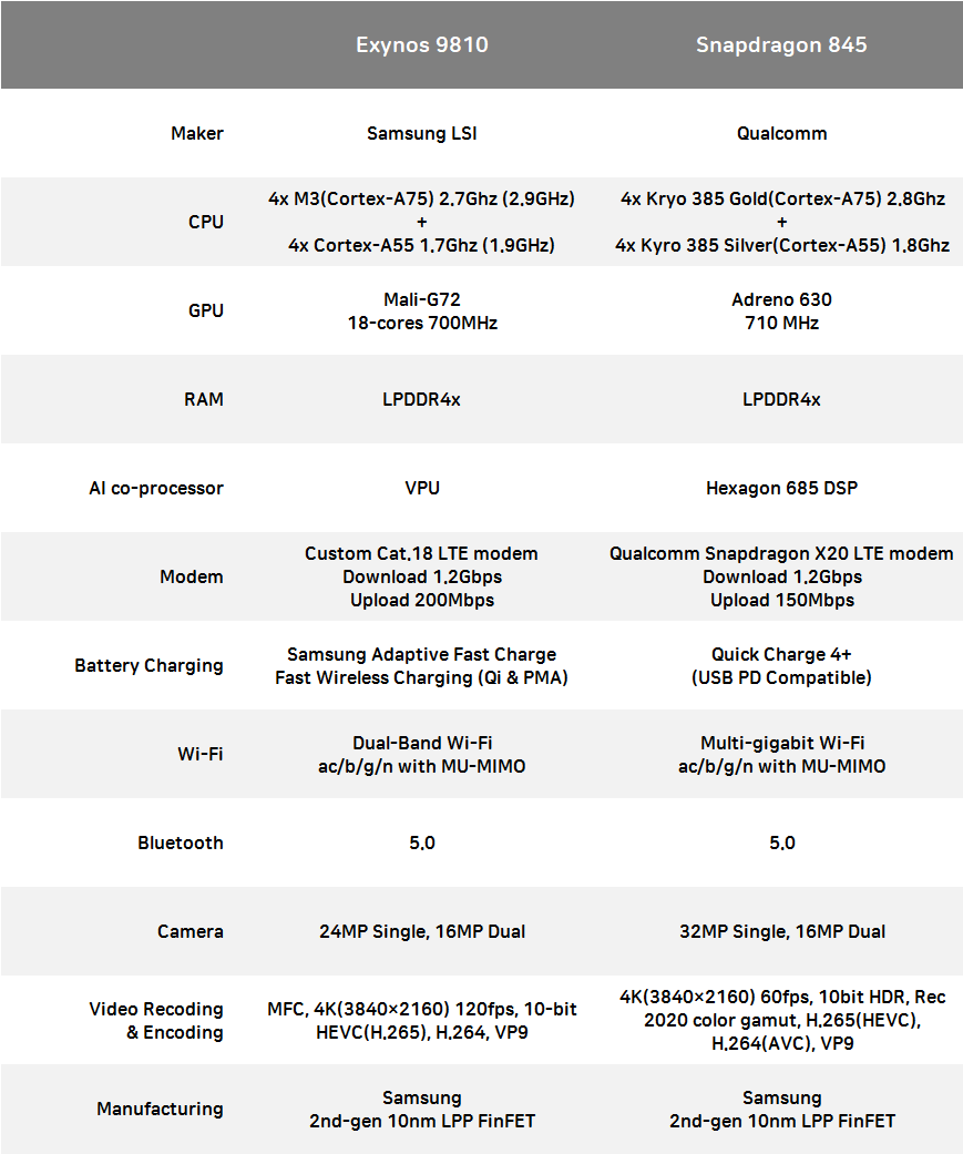 엑시노스 9 시리즈와 스냅드래곤 같은 경우 수많은 CPU 아키텍처 중에서도 ARM 아키텍처를 자체적으로 커스터마이징하여 사용하는 것으로 유명합니다. 엑시노스 9810과 스냅드래곤 845는 동일하게 ARM Cortex-A75를 자체적으로 커스텀한 아키텍처를 고성능 빅코어로 사용하고 있으며, ARM Cortex-A55를 삼성전자는 그대로, 퀄컴은 커스터마이징하여 저전력 리틀코어로 사용해서 두 AP다 동일하게 옥타코어(Octa Core) Big.LITTLE 구조로 되어있습니다.