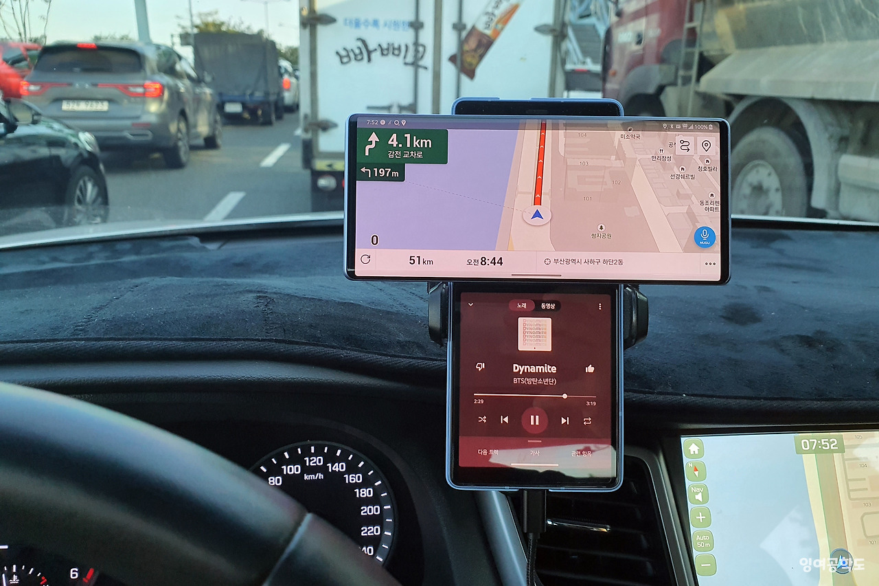 스위블 모드에 있어서는 괜찮다는 생각과 함께 호환성에 있어서 너무나도 아쉽게 다가온 경우가 많았습니다. 먼저 괜찮게 다가온 부분부터 살펴보자면, 대표적으로 차량에서 사용할 때를 손에 꼽을 수 있습니다. 그동안 장거리 운전 시 스마트폰 화면을 2:1 비율로 나누어서 내비게이션 앱과 음악 앱을 띄워두었는데, LG WING에서는 스위블 폼팩터를 활용하여 가로로 큰 화면에 내비게이션 앱을, 아래의 작은 화면에 음악 재생 화면을 띄워두니 정말 편리했습니다. 이외에도 여러 작업을 동시에 할 때, 작은 화면을 사용해도 문제없는 앱에 대해서는 매우 큰 편리함을 가져다주었습니다.