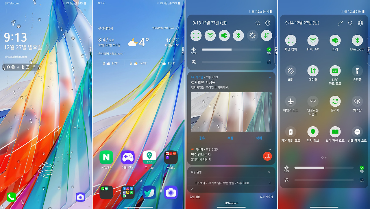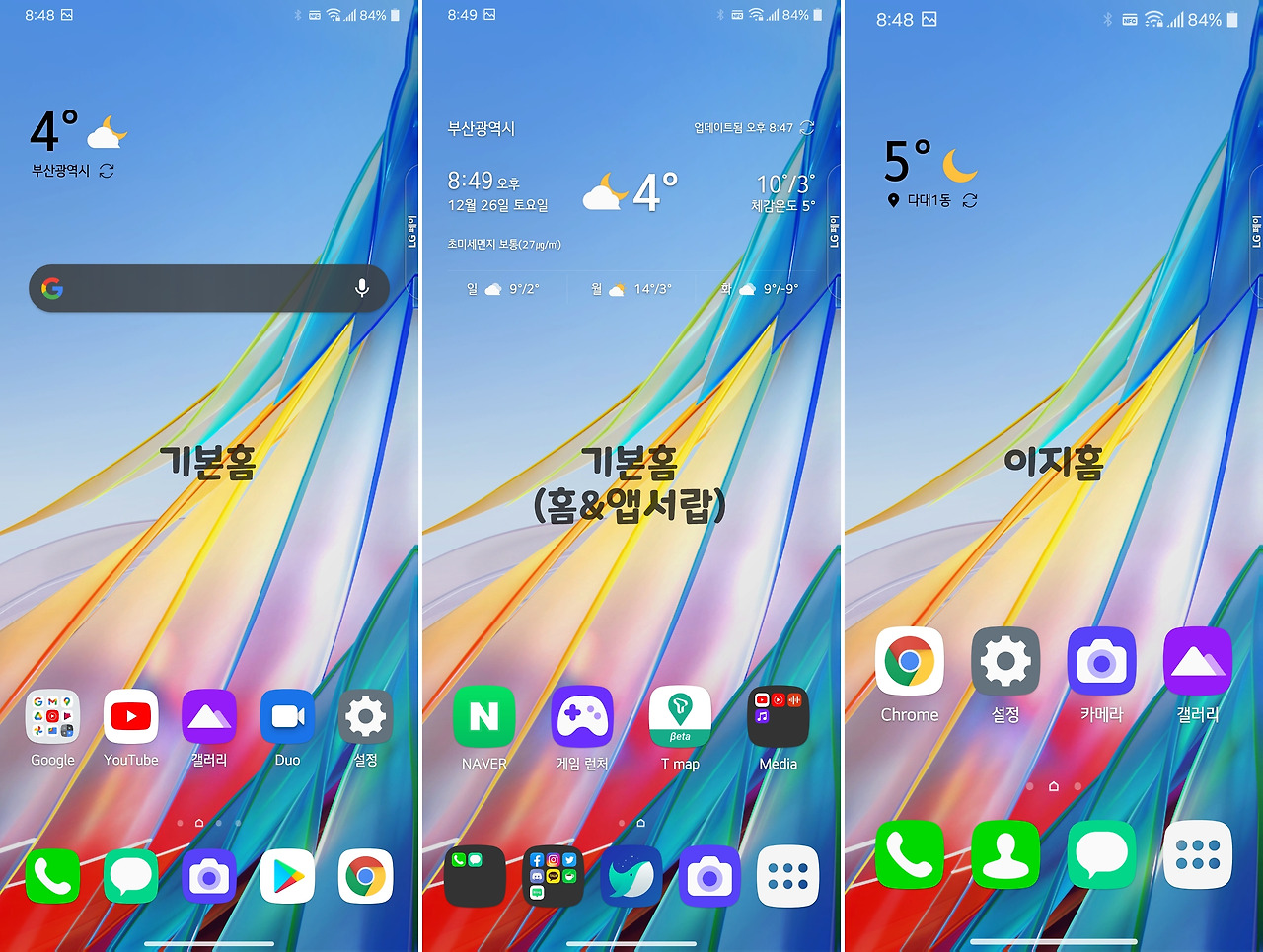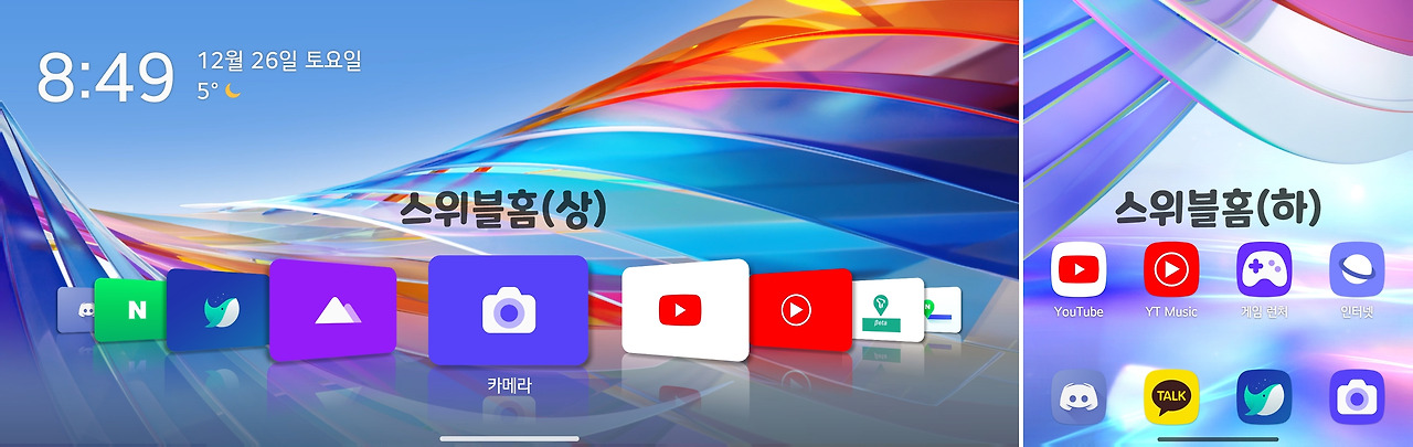 먼저, LG WING에는 무려 다섯 가지의 홈이 내장되어있습니다. 기본적으로 스위블 하지 않은 상태에서 기본 홈, 기본 홈(홈&앱 서랍), 이지홈 이렇게 세 가지를 제공하고 있으며, 스위블 한 상태에서는 두 개의 화면에 각각 스위블 모드 전용 홈이 실행되는 구조입니다.