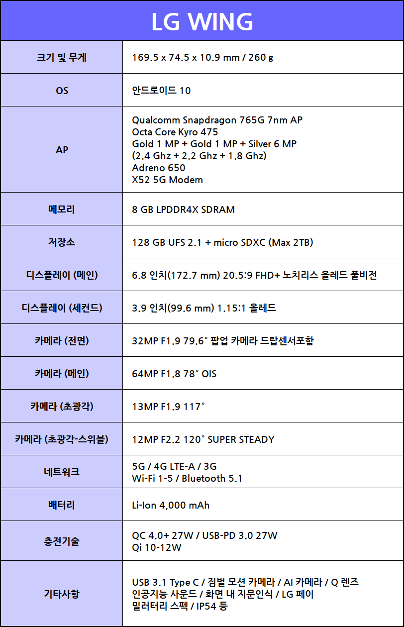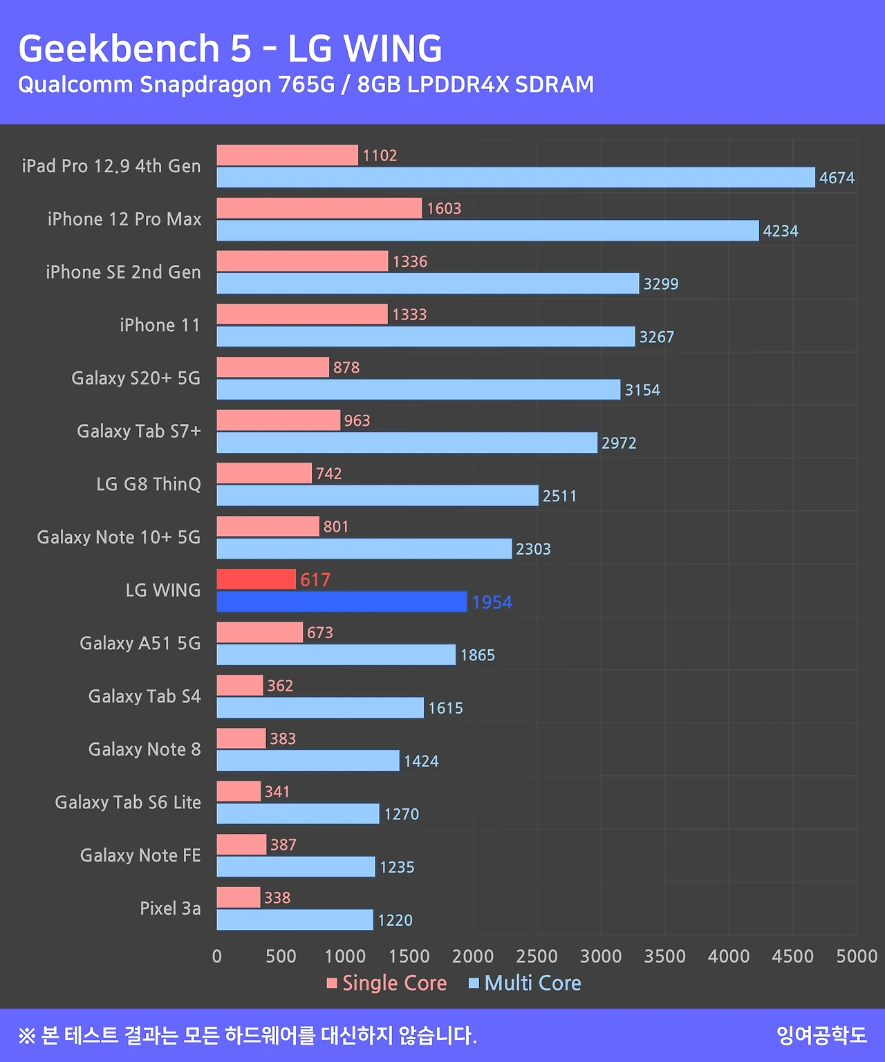 1+1+6 구조의 ARM big.LITTLE 설루션을 사용하는 Qualcomm Snapdragon 765G 플랫폼을 사용하는 LG WING의 성능은 프리미엄 제품이라 부르기 참 미안할 정도로 정말 아쉬운 성능을 보여주고 있습니다. SD765G가 5G 원칩이라 보드 설계 측면에서 상대적으로 유리하다는 장점을 제외하면 이득이 전혀 없는 상황이나 다름없습니다.