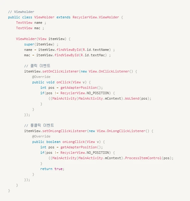 RecyclerTextAdapter.java에서 ViewHolder를 통해서 클릭 이벤트를 처리합니다. 사용자가 리스트 내의 아이템을 클릭하면, 아이템이 몇 번째 아이템인지 getAdapterPosition을 통해서 받은 뒤 MainActivity.java의 WoLSend 함수로 전달합니다.