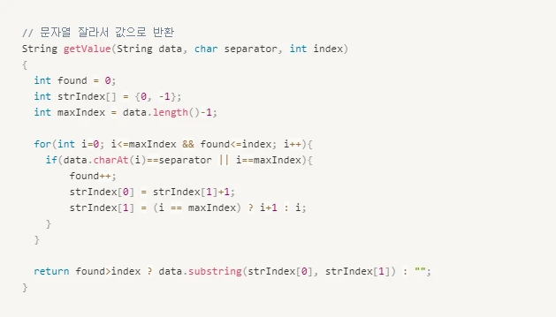 WebPage에서 정상적으로 접속될 경우 사용되는 getValue 함수는 스택오버플로우에서 찾은 코드로 split이 없는 아두이노에서 정해진 문자를 기준으로 문자열을 잘라서 값을 리턴해주는 함수입니다.