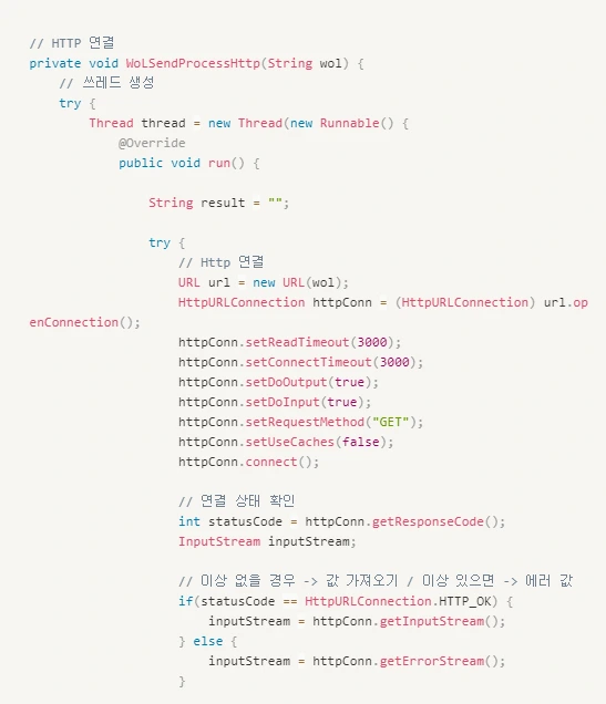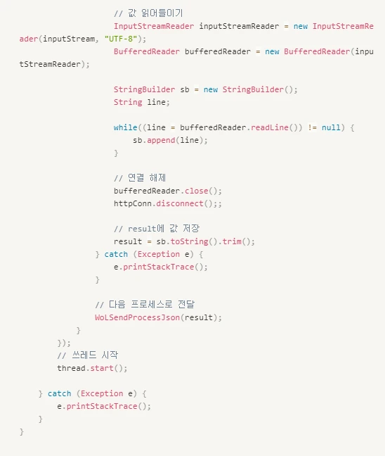 HTTP로 Request를 보내는 과정에서는 안드로이드 권장에 따라 별도의 스레드로 동작하며, Base64로 인코딩 된 파라미터가 전송되고 난 이후, 결과 값을 읽어 들여서 JSON으로 반환, WoLSendProcessJson 함수로 전달합니다.