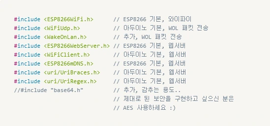 ESP8266과 아두이노(본 글에서는 NodeMCU)로 웹서버와 WoL을 구현하기 위해서는 다음과 같은 라이브러리가 필요로 하고 있습니다.