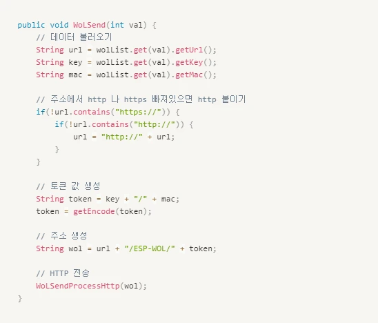 WoLSend 함수에서는 아이템 정보를 바탕으로 WOL 관련 정보가 들어있는 ArrayList에서 해당 정보를 불러온 뒤, Base64로 인코딩 처리하고 주소를 생성해서 Http Request 처리를 담당하는 WoLSendProcessHttp 함수로 전달합니다.