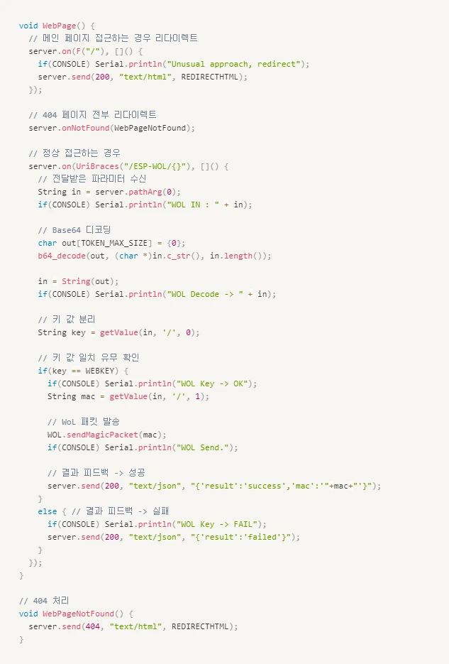그리고 ESP-WOL 경로로 접속한 경우에 대해서 파라미터를 전달받아서 Base64로 디코딩 처리하고 포함되어있는 KEY 값이 일치하는 경우, 같이 온 MAC 주소로 WOL 패킷을 발송, 이후 JSON으로 작성된 결과를 피드백해줍니다.