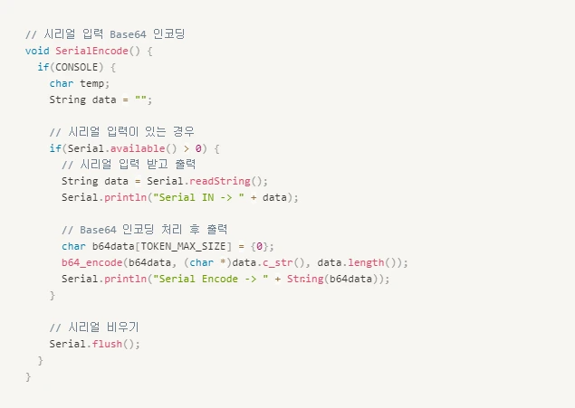 loop에 있는 SerialEncode 함수는 시리얼로 값을 입력하면 Base64로 인코딩해서 피드백해주는 함수입니다. 웹서버 동작 테스트 목적으로 만들어둔 함수로 없어도 사용에는 지장이 없습니다.