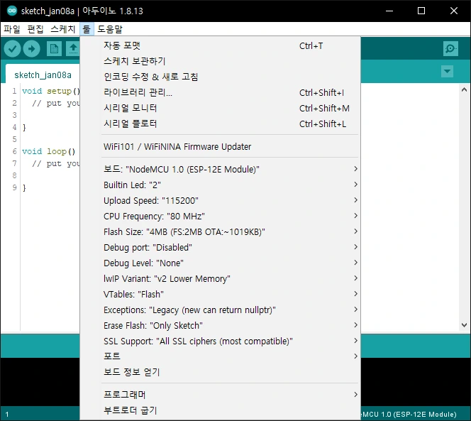 정상적으로 문제없이 설치가 완료되었으면 "툴 > 보드"에서 ESP8266 Boards를 확인하실 수 있습니다. NodeMCU를 찾아서 선택하면 모든 작업 환경 설정은 끝났습니다.
