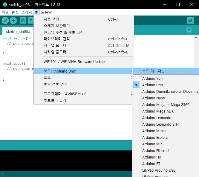 이후 "툴 > 보드 > 보드 매니저"로 가서 ESP를 검색하면 올라오는 ESP8266을 설치하는 것으로 간편하게 보드 정보 추가가 끝납니다.