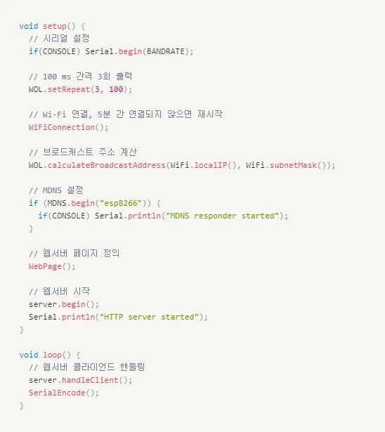 setup과 loop는 심플합니다. setup에서 와이파이를 연결하고 WOL관련 설정을 한 뒤 웹서버를 정의하고 실행시키며, loop에서 웹서버 클라이언트 접속 처리 및 시리얼 모니터링 관련 처리를 진행합니다.