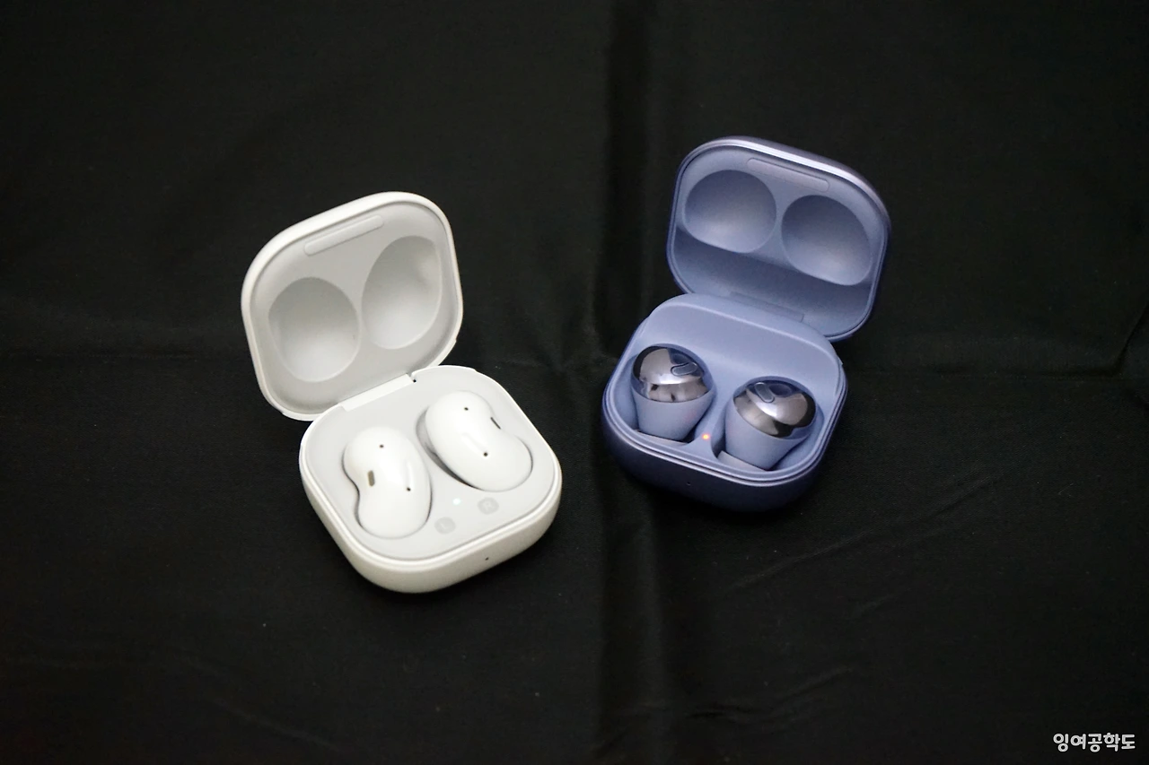 외관이 일치하는 만큼 내부 구조에 있어서는 이어 버드 모양에 따라 확실하게 차이를 보여주고 있습니다. 전반적으로 중앙에 위치하고 있는 갤럭시 버즈 라이브와 달리 갤럭시 버즈 프로는 최대한 앞쪽으로 나와있으며, 뒤쪽으로는 배터리 공간을 확보하기 위해 위로 올라갔습니다.