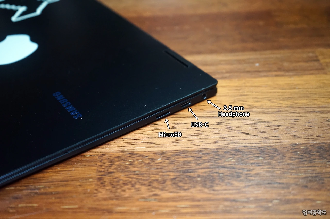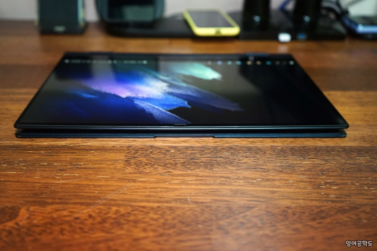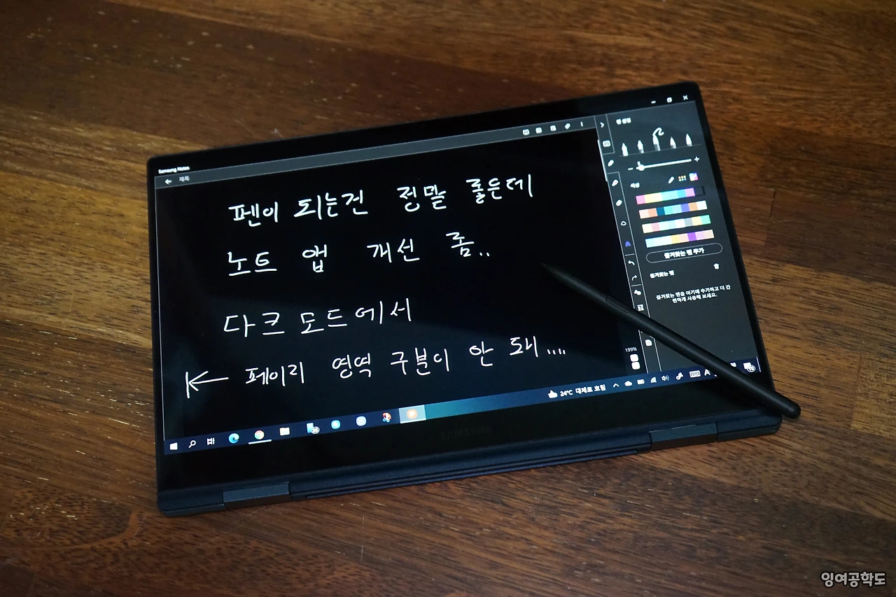 컨버터블 PC 답게 화면을 180도 돌려서 태블릿 형태로 사용이 가능한데요, 클램쉘 디자인을 가지고 있기 때문에 갤럭시 북 FLEX와 다르게 끝 부분이 약간 떠 있는 형태가 됩니다. 사용하는 데 있어 크게 문제 될 요소는 아니지만, 왠지 모르게 심적으로 끝 부분이 눌러지다 보면 휘어질 것 같다는 느낌이 들기도 합니다. 특히, 펜을 활용해서 무언가 그리거나 메모를 할 때 말이지요.