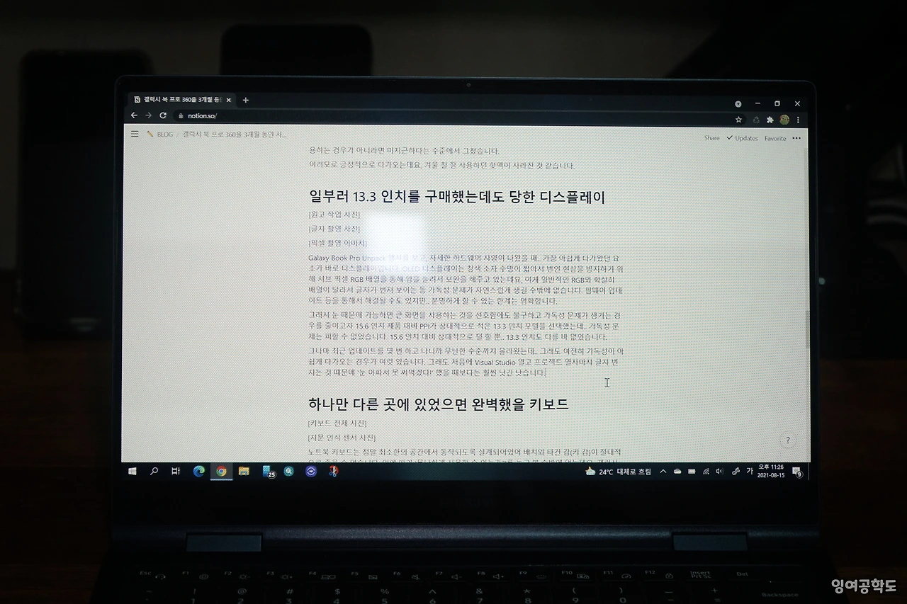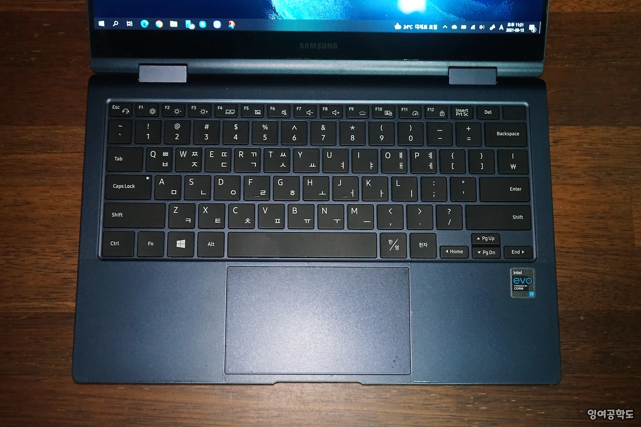 그리고 타건, 확실히 이전 세대 삼성 노트북과 비교해서 나아졌습니다. 이전 세대 이온이나 FLEX 같은 경우 타이핑하다 보면 뭔가 물렁하다고 해야 될까요? 약간 밑에서 무언가 덜 받쳐준다는 느낌이 강하게 들었는데.. 프로 360은 비슷한 느낌을 가지고 있으면서도 조금 더 단단하게 받쳐준다는 느낌이 강하게 들어서 키 감이 좋은 것은 아니지만 무난하다는 생각이 참 많이 들고 있습니다.