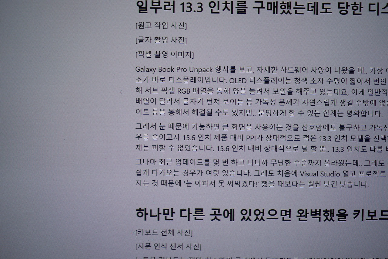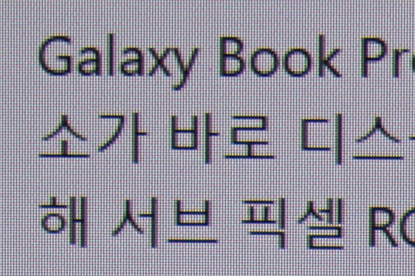Galaxy Book Pro Unpack 행사를 보고, 자세한 하드웨어 사양이 나왔을 때.. 가장 아쉽게 다가왔던 요소가 바로 디스플레이입니다. OLED 디스플레이는 청색 소자 수명이 짧아서 번인 현상을 방지하기 위해 서브 픽셀 RGB 배열을 통해 양을 늘려서 보완을 해주고 있는데요, 이게 일반적인 RGB와 확실히 배열이 달라서 글자가 번져 보이는 등 가독성 문제가 자연스럽게 생길 수밖에 없습니다. 펌웨어 업데이트 등을 통해서 해결될 수도 있지만.. 분명하게 할 수 있는 한계는 명확합니다.