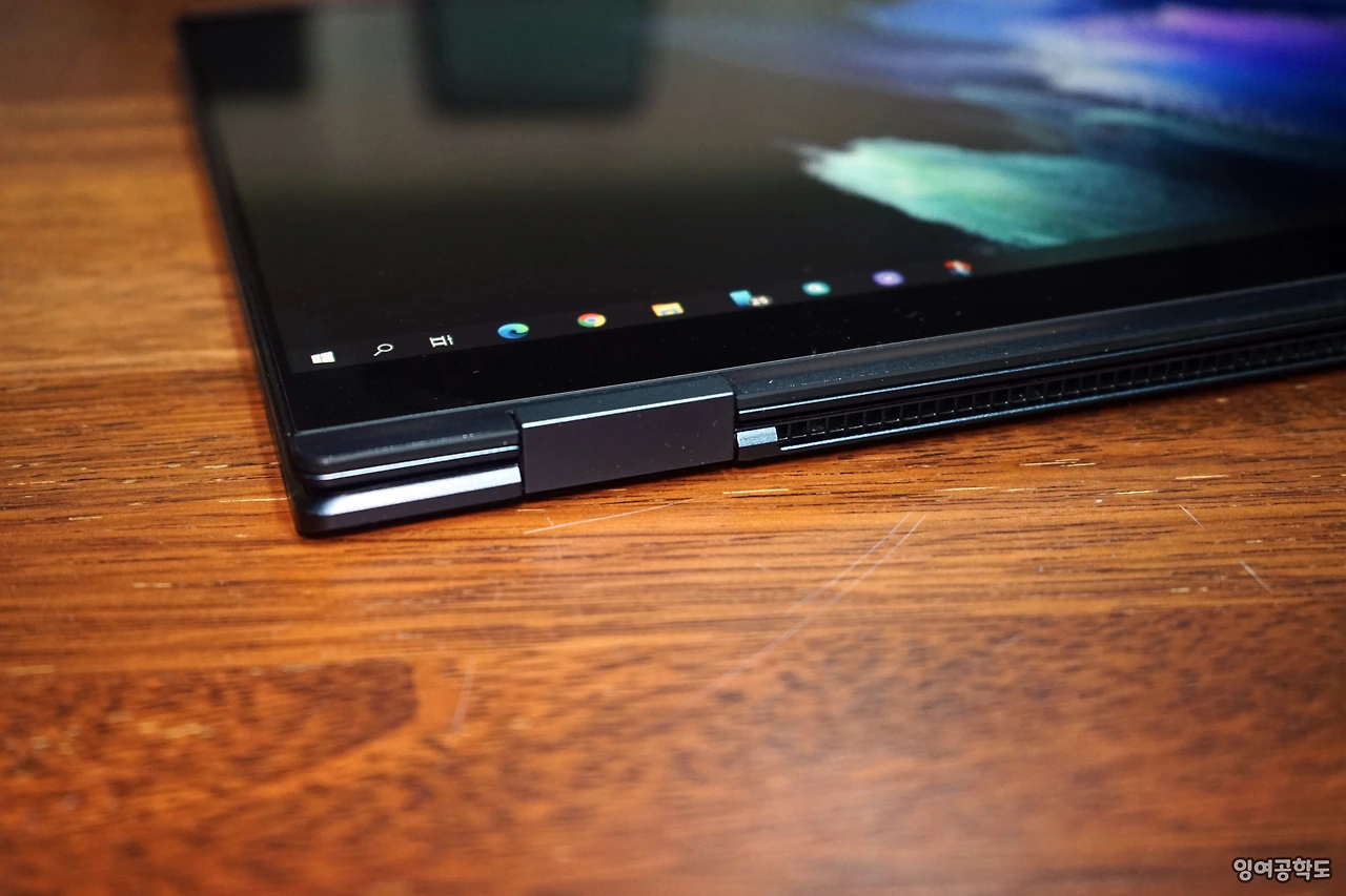 화면을 360도 회전하여 태블릿 형태로 사용할 수 있다 보니, 힌지는 정말 중요한 요소 중 하나인데요, 두말할 필요도 없이 갤럭시 북 프로 360의 힌지는 정말 아쉽다 못해 리콜을 해주어도 시원치 않을 요소입니다. 흔히 건담 프라모델 등에서 이중 관절이라 이야기하는 구조로 되어있는데, 하드웨어 설계 및 디자인 측면에서 정말 잘 되어있습니다.